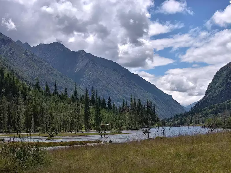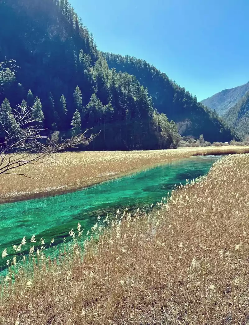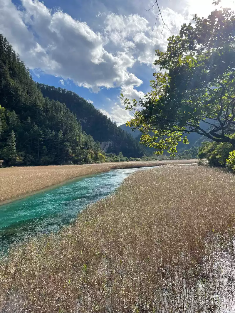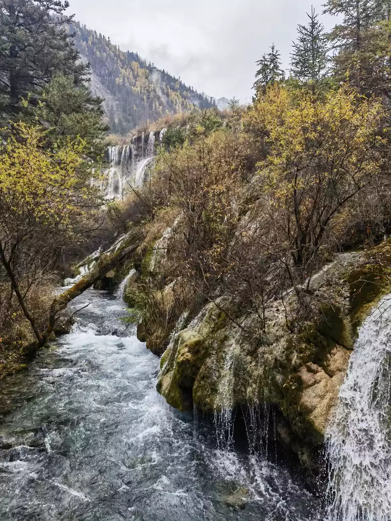 It's a little regrettable that the weather was a little gloomy this morning, and it didn't clear up until 11 o'clock, and some attractions were not as beautiful as the mountains and rivers in the pictures on the Internet, but there was also a melancholic beauty in Jiuzhai on a cloudy day! In addition, because of time constraints, the sea of reeds in Shuzhenggou did not go, and the blue ribbons scattered in the reeds could only be saved for next time.