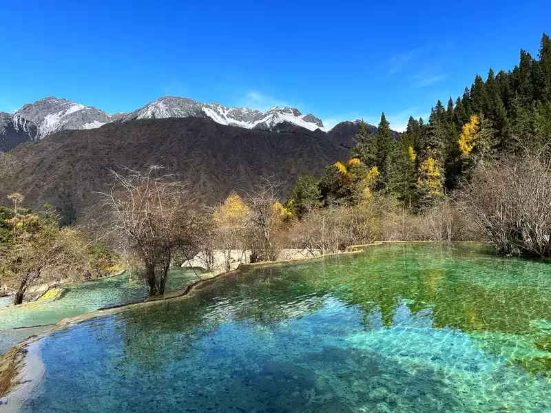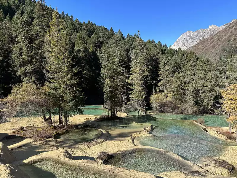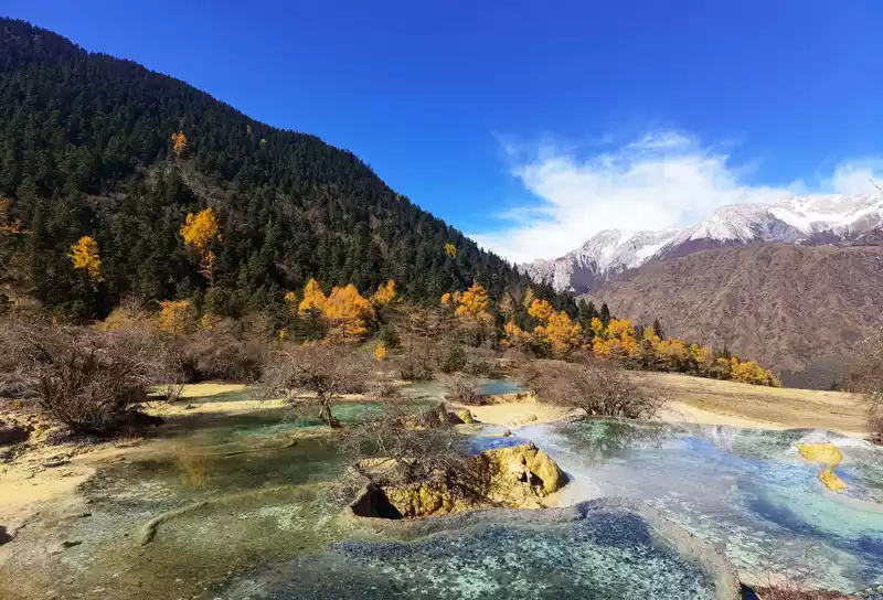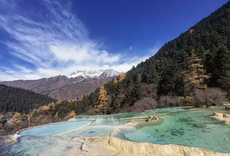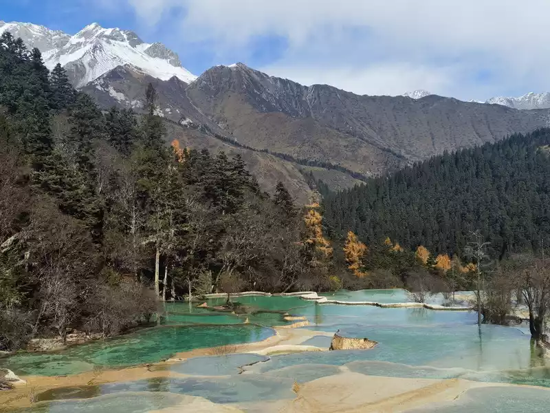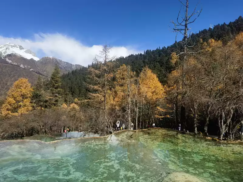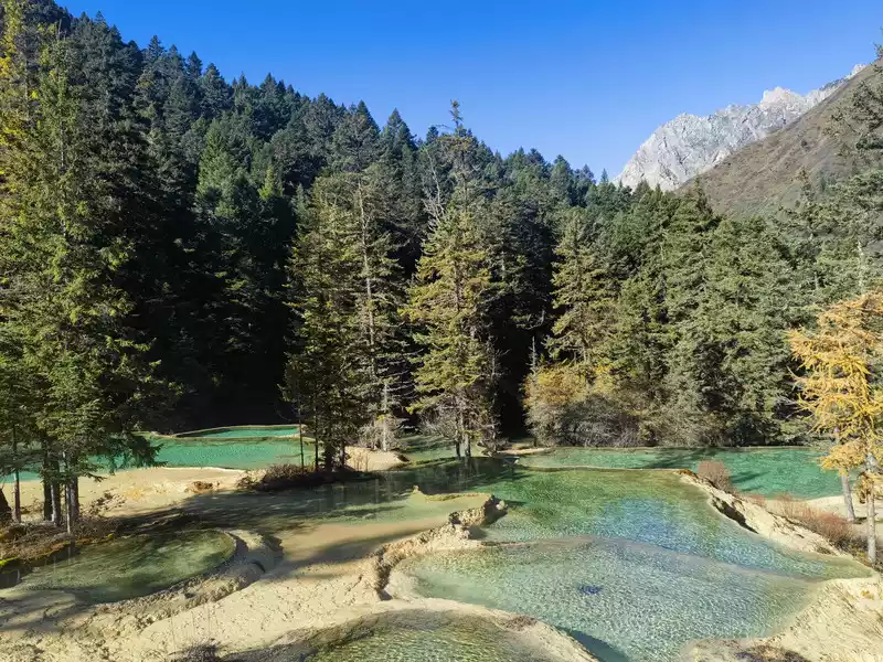 Compared with Jiuzhaigou, the scenery of Huanglong is slightly monotonous, mainly with a large area of calcified pools and stream waterfalls. The color pool is layered like terraced fields, and the pool water is green and clear, like a mirror reflecting the blue sky and white clouds, like a color palette left by heaven in the world.