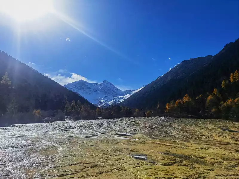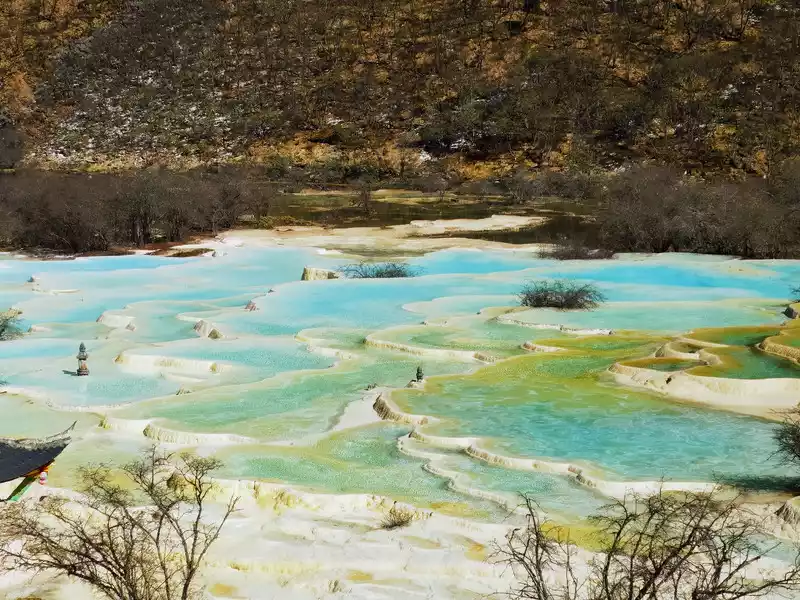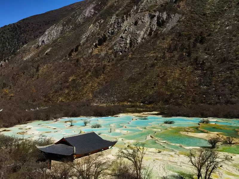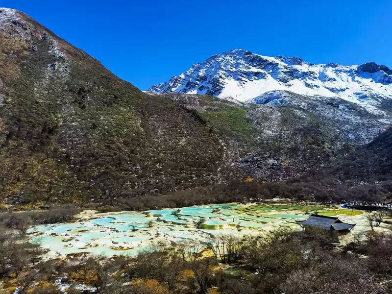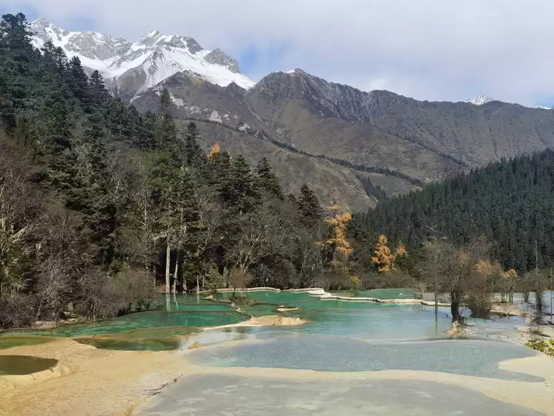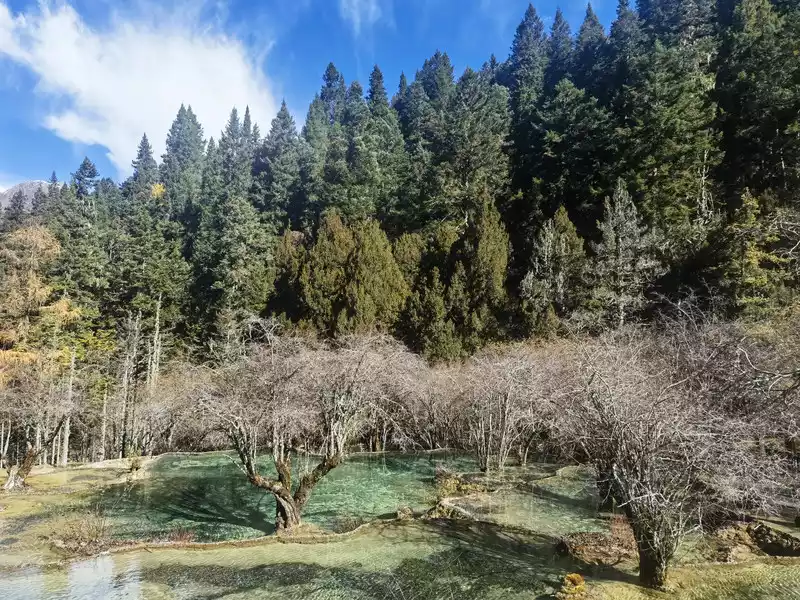 Compared with Jiuzhaigou, the scenery of Huanglong is slightly monotonous, mainly with a large area of calcified pools and stream waterfalls. The color pool is layered like terraced fields, and the pool water is green and clear, like a mirror reflecting the blue sky and white clouds, like a color palette left by heaven in the world.