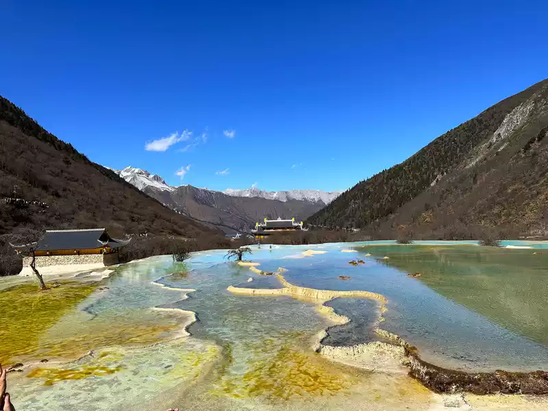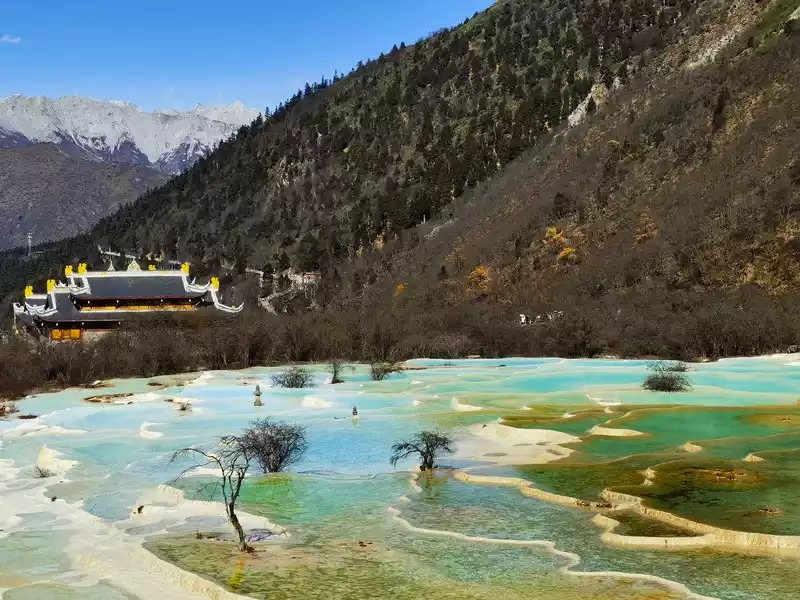 , let's talk about Huanglong. Huanglong is located in Songpan County, about 100 kilometers away from Jiuzhaigou, is a well-protected plateau wetland in our country, and the Huanglong Scenic Area is full of carbonate travertine deposits, arranged in terraces, enjoying the reputation of "World Wonder". The color pool group in Huanglonggou is the world's largest and highest open-air travertine pool group, known as the "Yao Pool on Earth".