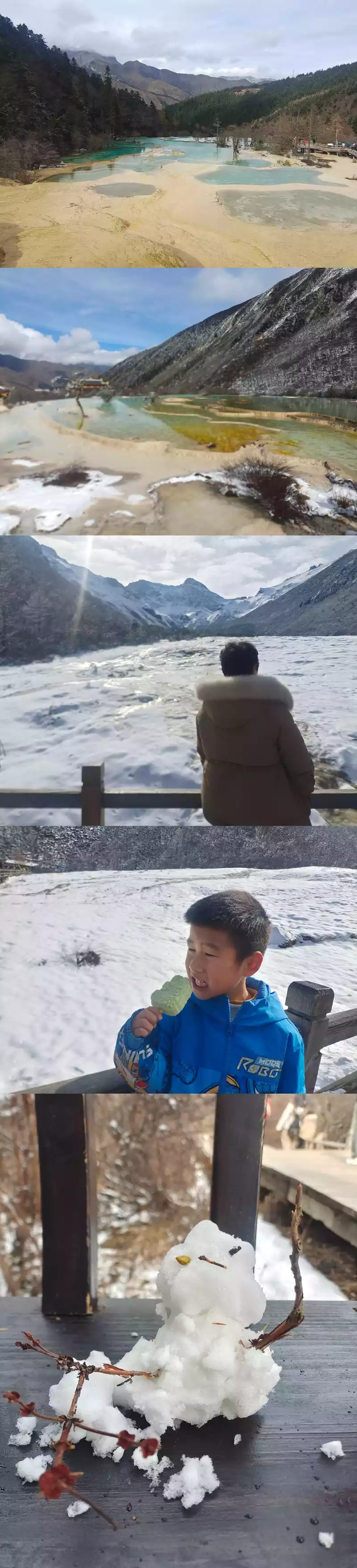 Huanglong didn't plan to go at first, just went nearby, it was worth it after seeing it, got on the cable car, saw the snow-capped mountains, high mountains, and blue ice, blue ice is a landscape only in Jiuzhaigou in winter, that is, the water crystallizes blue ice, I didn't expect to see it in the Huanglong Colorful Pool. Buy tickets on the official website half a month in advance, tickets + ropeway + scenic delivery, you have to buy, 5,000 tickets a day for trial operation of the scenic delivery car, the previous peak season to grab, you can still buy it when you go to the scene that day. I signed up for a one-day tour on China-TravelNote, there is no tour guide, only including Jiuzhaigou to Huanglong Scenic Area, transportation from the scenic spot to the high-speed rail station, bus, get on the bus at the agreed place at the mouth of the gully at 8 o'clock, arrive at the scenic spot, play by yourself for 4 hours, in fact, our car arrived early, played for 5 hours, and can be sent to the high-speed rail station after the end, and the luggage can also be placed in the bus, which is more convenient than reversing by yourself. There is hot water in the scenic spot, we brought instant noodles for lunch, and it was still delicious to eat at the foot of the snow-capped mountains, and I accidentally found that the powder pack of Master Kong's fresh shrimp noodles in Chengdu supermarket was spicy! There is a restaurant on the way down the mountain in the scenic area, just on the side of the plank road, which is very conspicuous. The only bad thing about the one-day group is to go to the high-speed rail station at the specified time, because the master has to pick up the guests at the station, and he waited for an hour at the high-speed rail station before departing, but that hour was in the service center opposite the high-speed rail station (the high-speed rail station is super crowded, the service center is empty, you can sit, there is hot water), it is not a waste to rest your feet and have dinner, Xiaohongshu someone recommends Chengdu beef noodles, the beef is spicy, the children did not eat it, the noodles are a little unspeakable, like overcooking but a little hard, maybe the altitude is high and the water temperature is not enough.