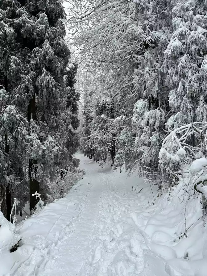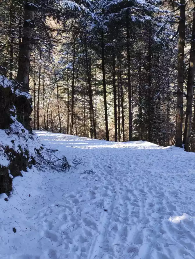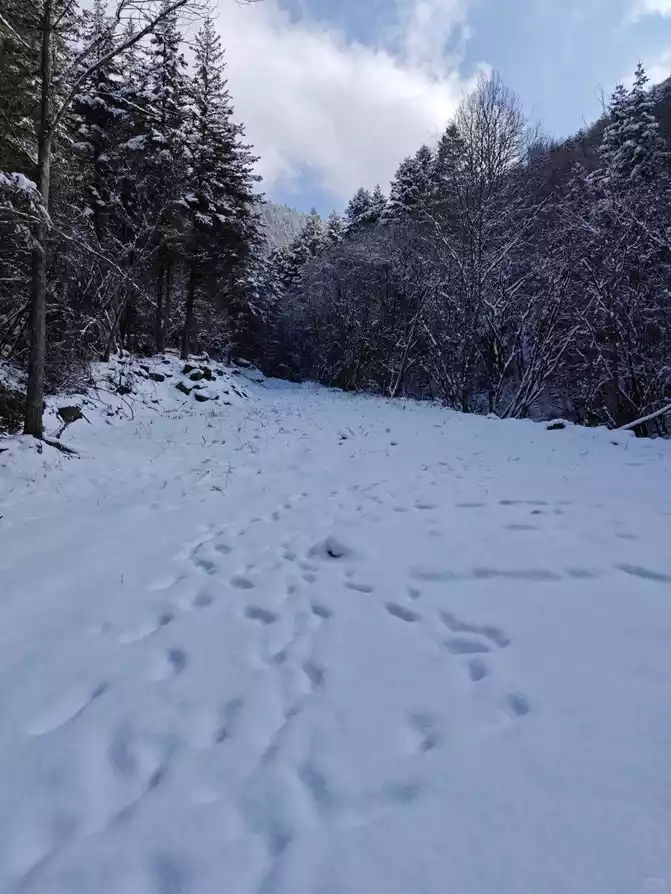 Note: After going up the road in the previous section, it is a big forest and a flat road, which is very comfortable to walk on, with few people and thick snow. The trajectory after snow on the second half of the mountain road is very inconspicuous, easy to get lost, and steep and slippery, unless the trajectory is prepared in advance~