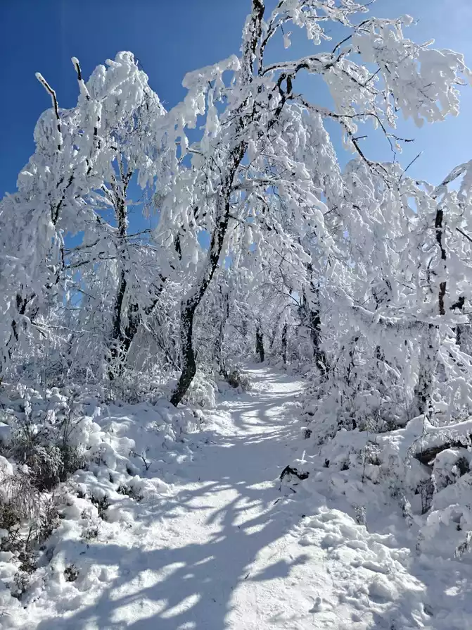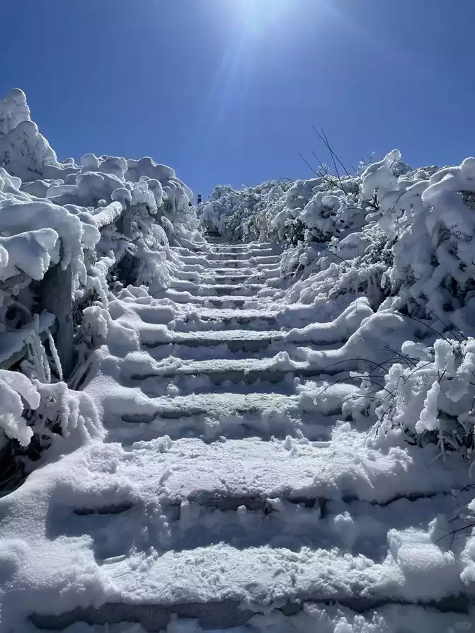 ❄ Play guide: Huangwan Visitor Center→ 🚌 two hours by sightseeing bus → Leidongping → 🚶🏻 ♂️ Walk 1.5 kilometers and a half hours to Jieyin Temple → 🚡 cable car for 3 minutes→ watch the sunrise and sunset at Jinding - hike down the mountain to Jieyin Hall →Leidongping Station→ take the sightseeing bus to the parking lot of Wannian Temple→ hike to Wannian Temple→ walk 1.5 kilometers to Bailong Cave (Bailong Temple→ walk 1.5 kilometers to Qingyin Pavilion →Wuxiangang Station→ take a bus out of the station to Huangwan Visitor Center