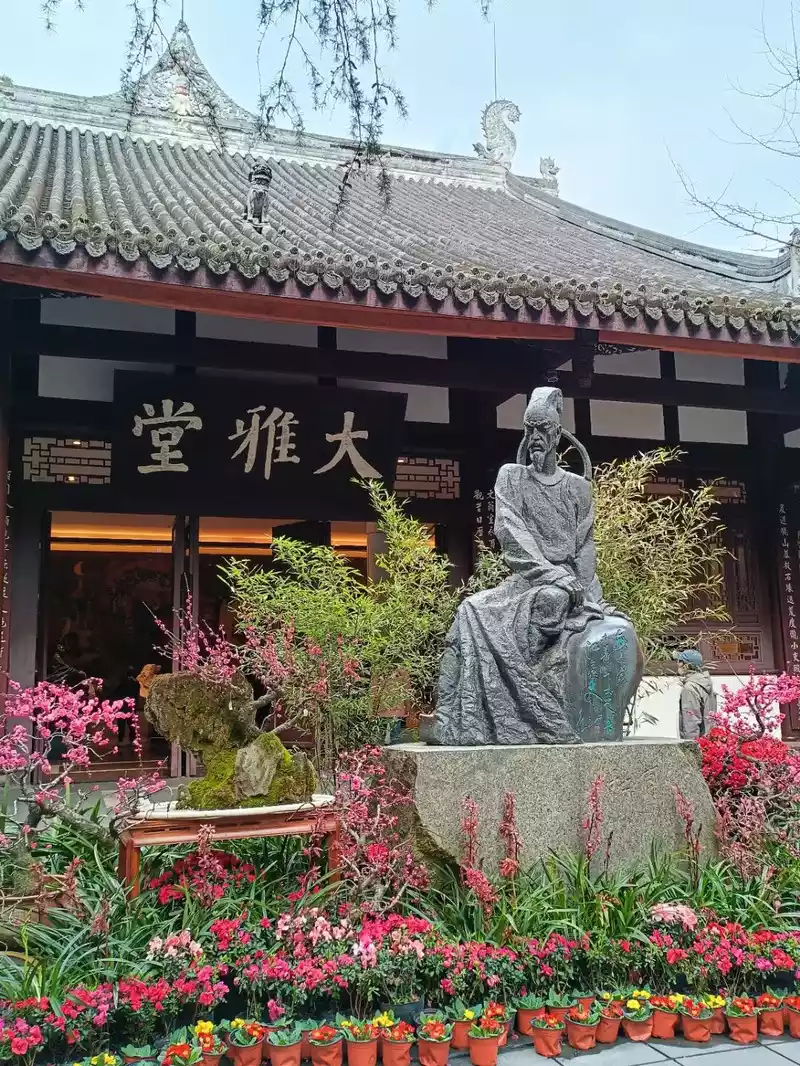 The Shishi Hall is the central building of the monumental ancestral hall of Du Fu's thatched cottage. In the center of the Poetry History Hall is the statue of Du Fu sculpted by the sculptor Liu Kaiqu, and the hall displays couplets and plaques inscribed by celebrities of all dynasties. The Ministry of Works Ancestral Hall enshrines a portrait of Du Fu, and there are poets Lu You and Huang Tingjian who once lived in Shu.