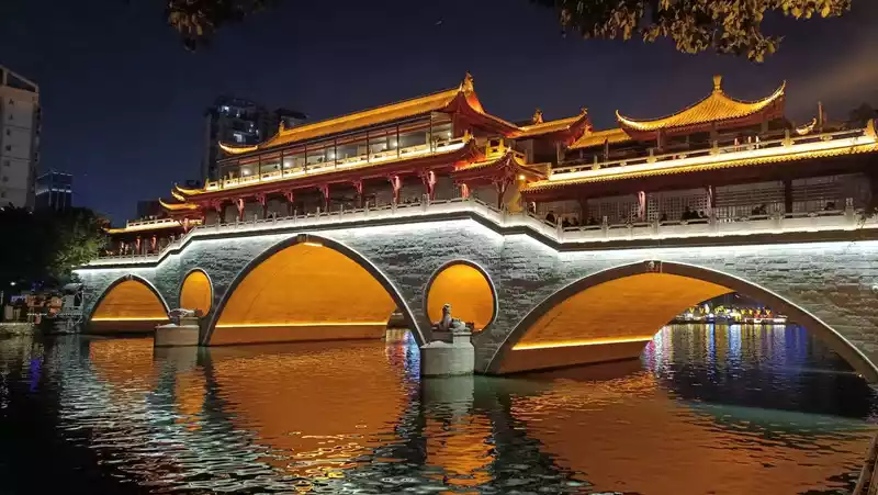 The Anshun Covered Bridge is located next to the Hejiang Pavilion at the confluence of the Chengdu Fu River and the South River, and at the beginning of the 21st century, after several constructions, it was restored to its original appearance in the Ming and Qing dynasties, and the bridge was named "Anshun", also known as "Hongqiao", which was safe and smooth.It has stood here for hundreds of years and has experienced countless ups and downs, but it still stands tenaciously. From a distance, it was majestic and majestic, and I was calmed down by its majestic momentum. The bridge is 81 meters long from north to south and 6 meters wide from east to west, all made of bluestone. There are three bridge arches and two-story corridors. There are two archways on both sides of the bridge, each engraved with four powerful characters "Anshun Covered Bridge".