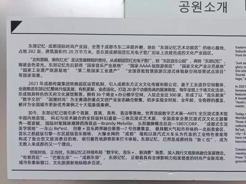 In 2009, Chengdu used the former site of the Chengdu Hongguang Electronic Tube Factory in the old industrial zone in the eastern suburbs to preserve some factories with distinctive industrial characteristics as industrial civilization sites, and combined them with cultural and creative industries to build a music industry base.