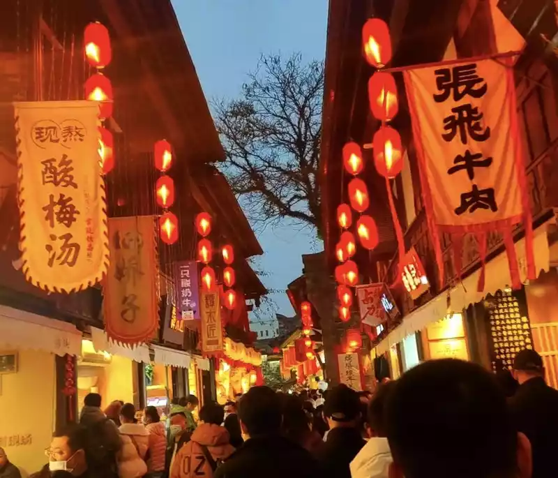 Jinli Ancient Street in the twilight is staging a carnival of taste. The sizzling sound of sugar and oil fruits churning in the iron pot, and the crisp vibrato of the bronze in the hands of the ear picking master, together compose a symphonic poem of market life. Every delicacy is irresistible, the softness of brown sugar glutinous rice cakes, the refreshing taste of dandan noodles, the spiciness of husband and wife lung slices, the fresh aroma of Zhongshui dumplings, and the steaming heat of spicy pot all overlap and bloom on the taste buds.