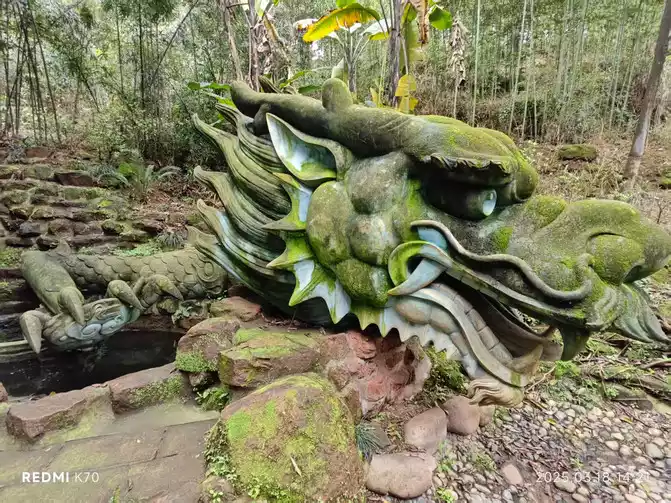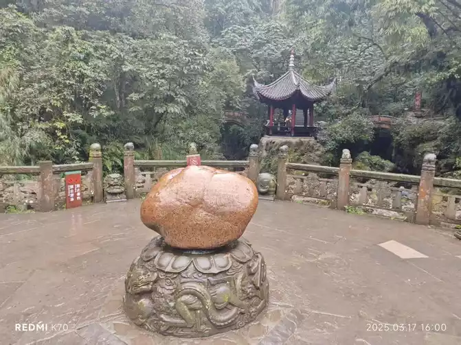 One of the ten views of Mount Emei, the "Double Bridge Qingyin", the clear stream crosses two small bridges, and the black and white streams under the bridge impact the boulders shaped like cow hearts in Bitan, splashing and making a sound like the sound of a piano, and there is a cow heart pavilion built on the stream. Its overall layout reflects the artistic conception of "natural creation, the unity of nature and man", and has become a model of Buddhist temple garden architecture.