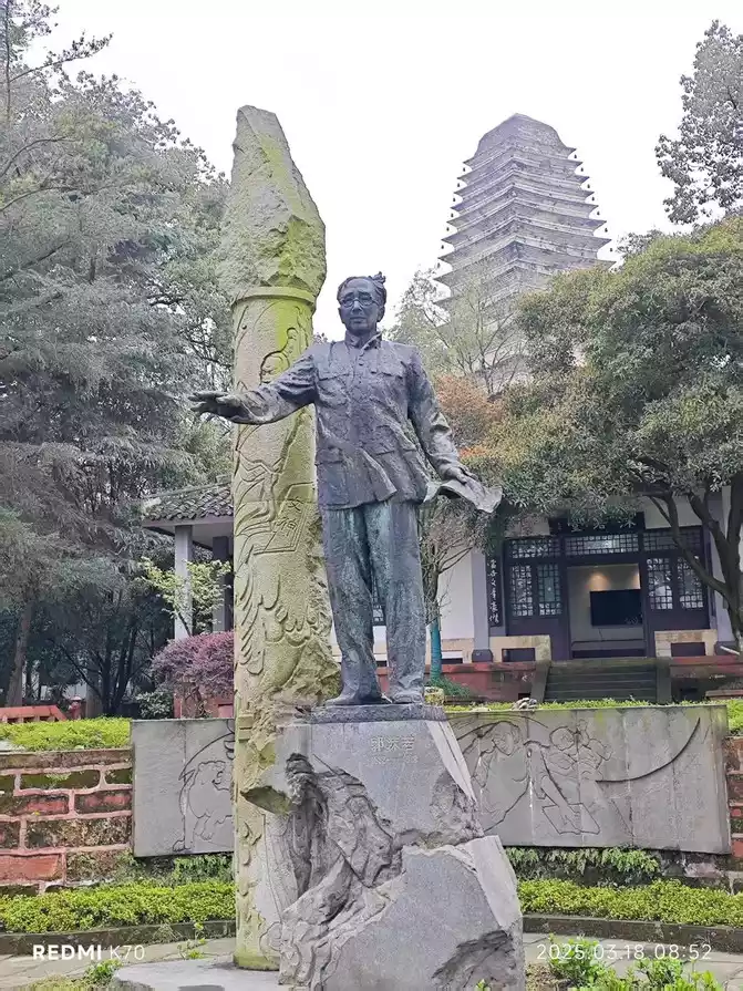Moruo Hall is located in the northwest corner of Lingbao Peak, the showroom is simple and elegant, and it is built to commemorate Guo Moruo, who was born in Shawan, Leshan. In front of the hall stands a full-body bronze statue of Guo Moruo giving a speech in Chongqing during the Anti-Japanese War, about 3 meters high, and a 6.5-meter-high granite pen stands next to the statue, with the pen shaft engraved with the goddess, Qu Yuan, and phoenix nirvana patterns, praising the achievements of a generation of literary heroes Guo Moruo in the history of literature.