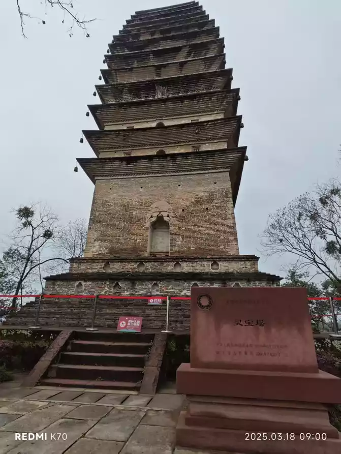 Lingbao Pagoda, also known as Lingyun Pagoda, is named after the mountain because it towers on the top of Lingbao Peak behind Lingyun Temple. The tower was built in the Tang Dynasty, the tower shape is a dense eaves square cone, made of bricks, sitting east to west, 29.29 meters high, a total of thirteen levels. The structure and style of the Lingbao Pagoda are similar to those of the Xi'an Xiaoyan Pagoda. In December 2006, it was announced by the State Council as a national key cultural relics protection unit.