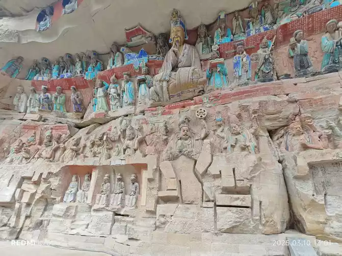 宝顶山石窟位于大足城区东北15公里的宝顶山,以大、小佛湾为中心,造像崖面长约500米,