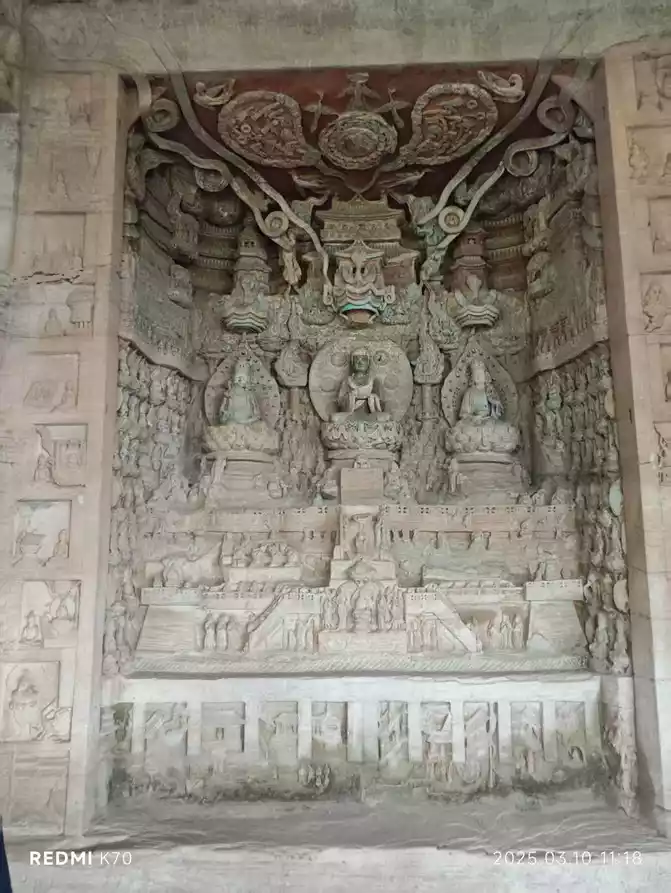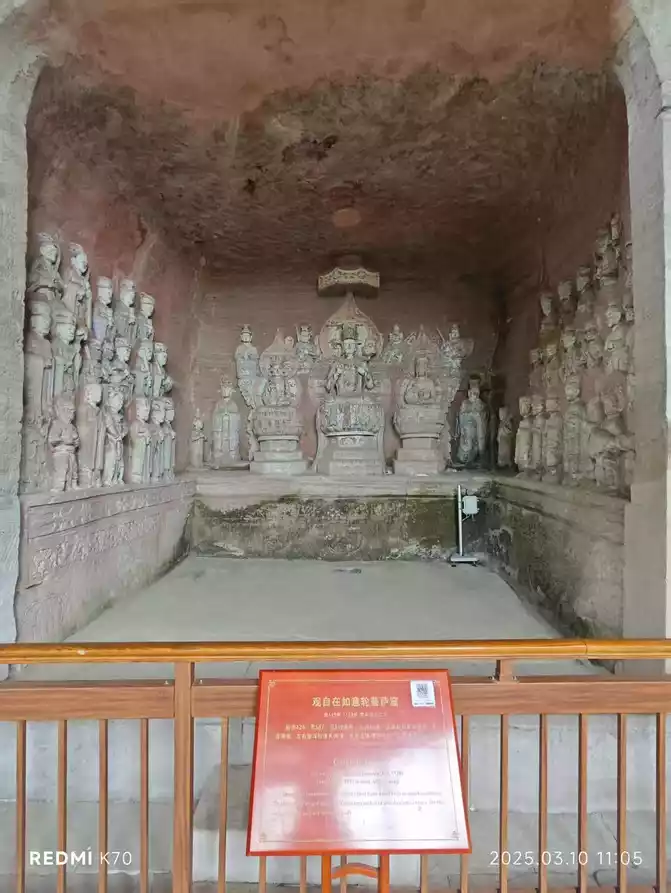 It is 8-25 meters high, and the statue is carved on the east, south and north cliffs.