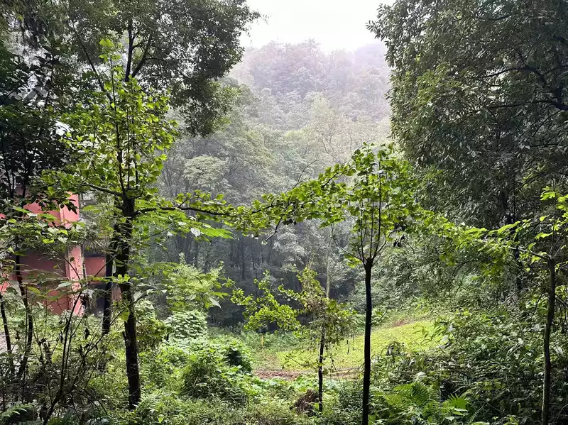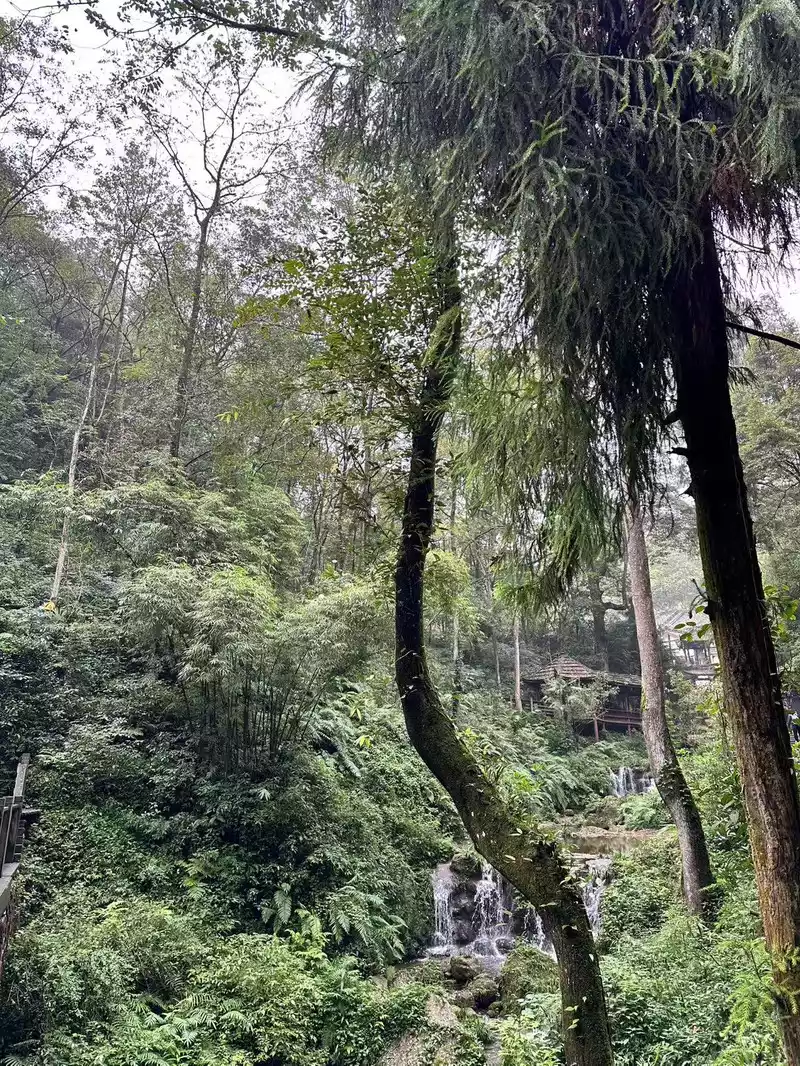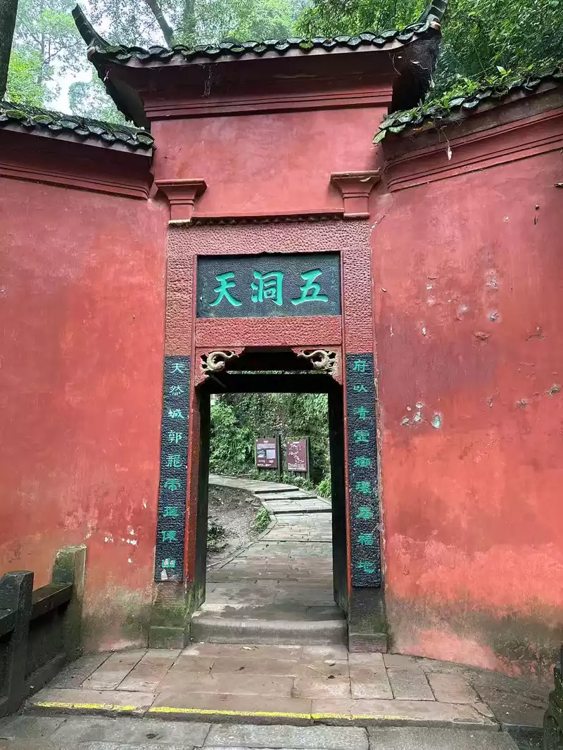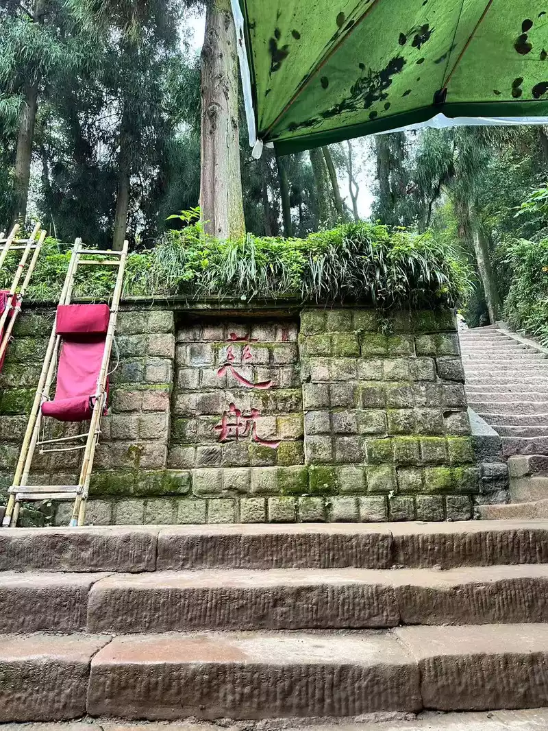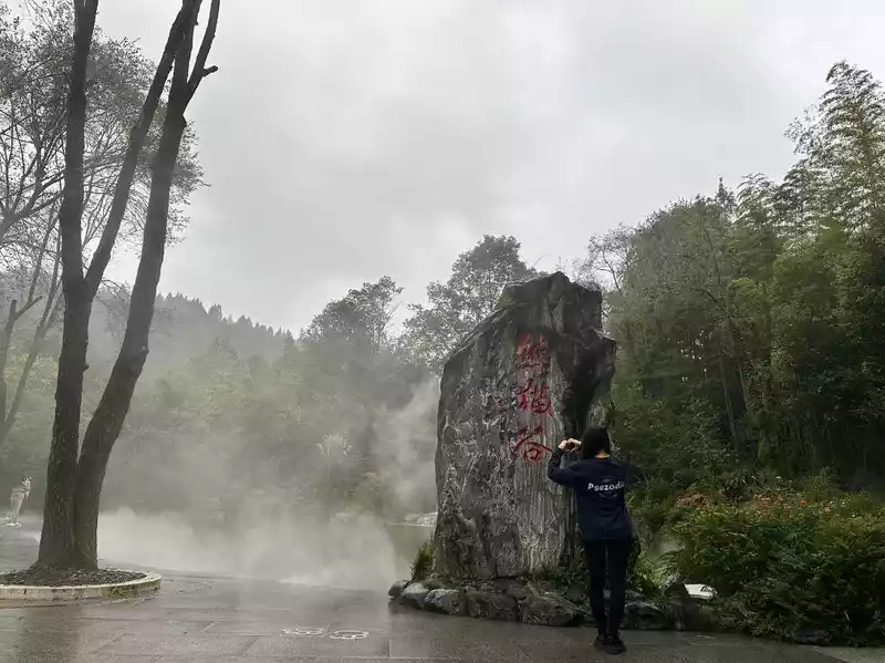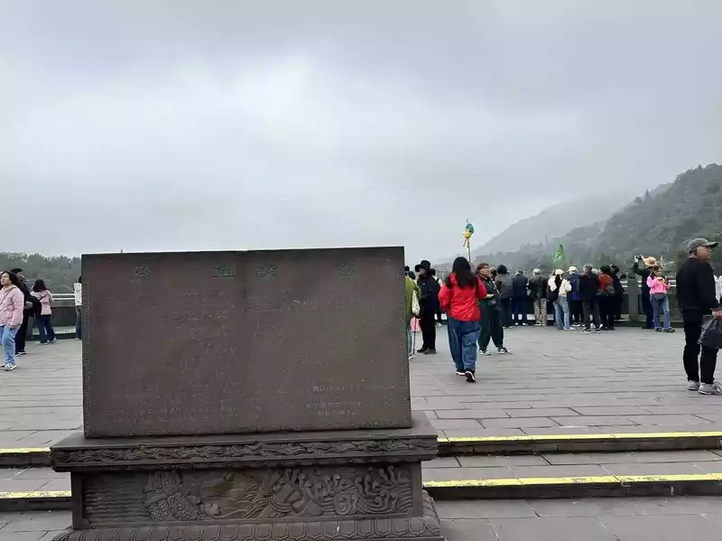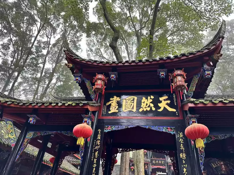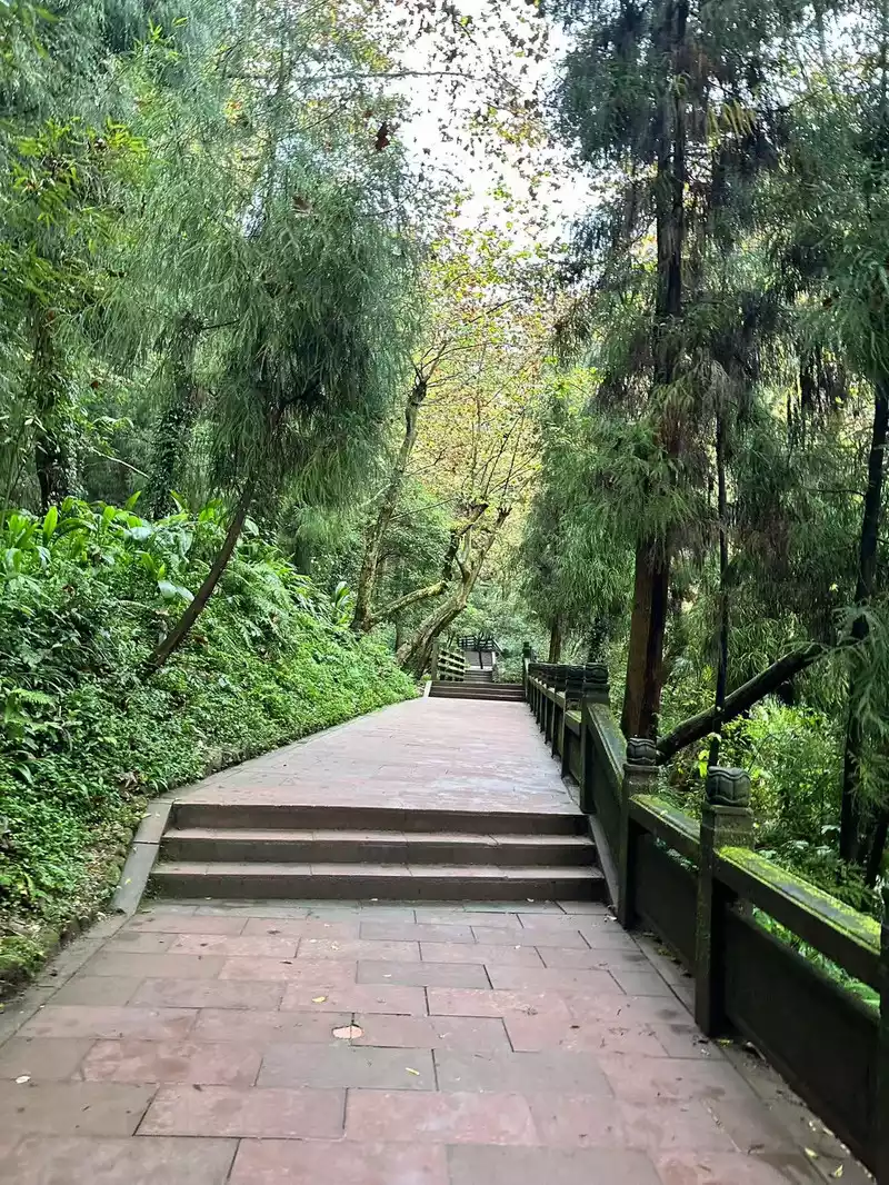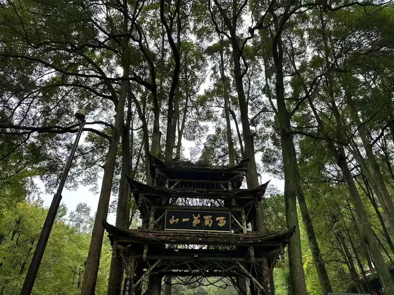 Before the morning rush hour, I took a taxi to the front of Qingcheng Mountain. Upon arrival, I took a sightseeing bus (round-trip ticket recommended) to the mountain gate. As the road was slippery, I bought a bamboo pole at the gate to prepare for the climb.