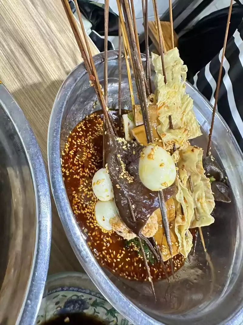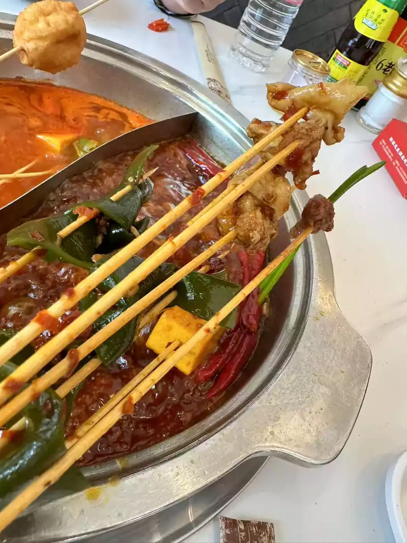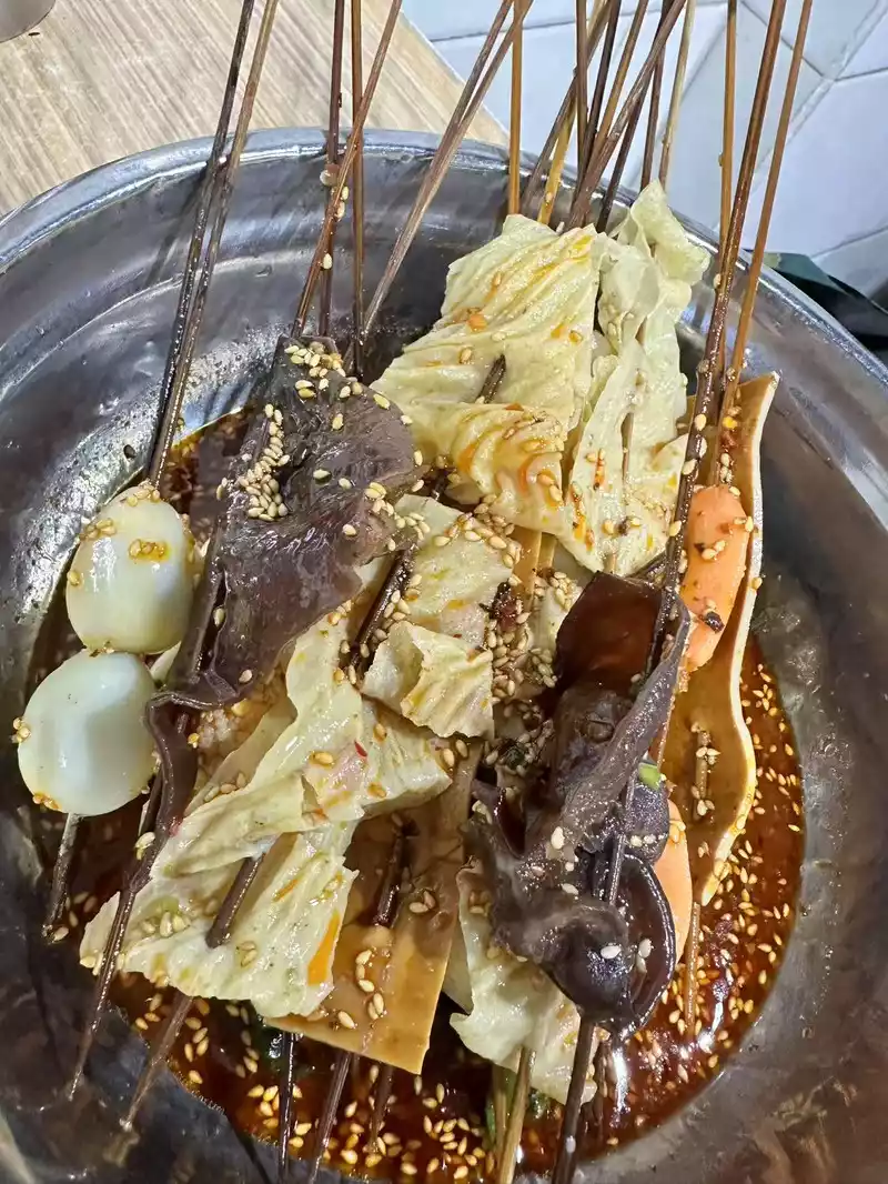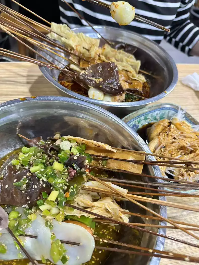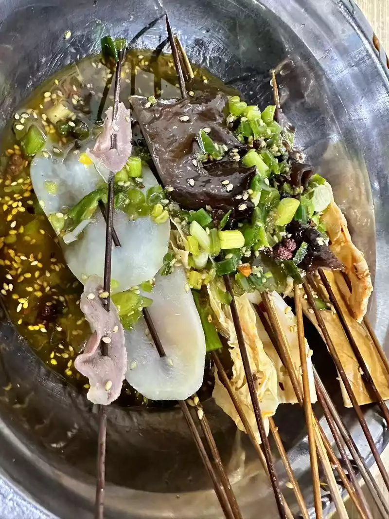 After a break, we went out to dinner at Leshan Xianzhiwei Bobo Chicken. Since we couldn't arrange a trip to Leshan on this trip, we took my mom to eat at the most famous Bobo Chicken restaurant in Chengdu. We chose the skewers ourselves and poured the sauce on them. My mom and I ordered one with Sichuan peppercorns and one with red oil, as well as a tofu bun. They were so delicious.