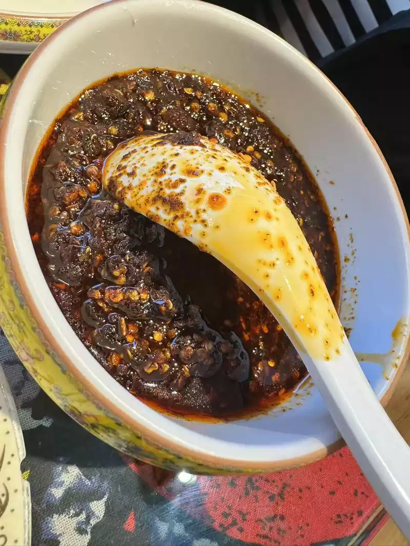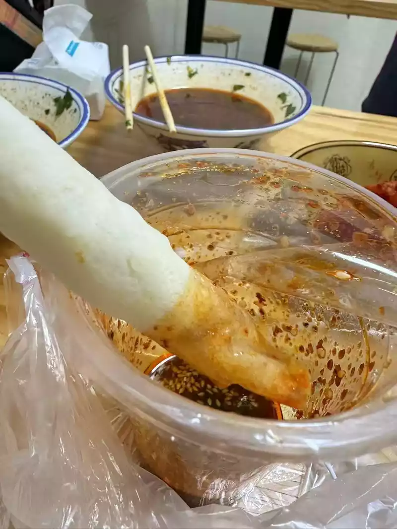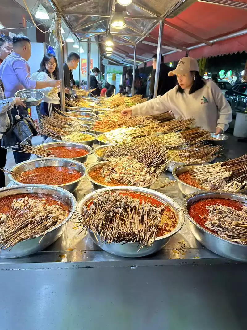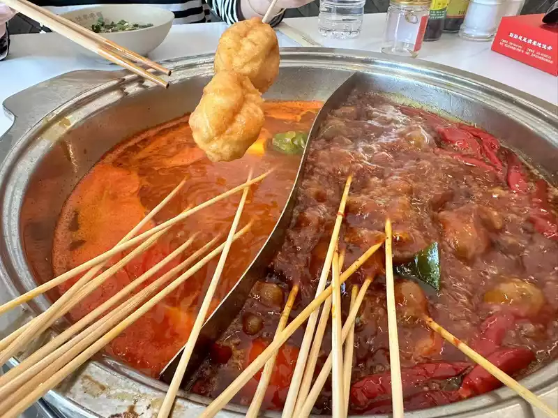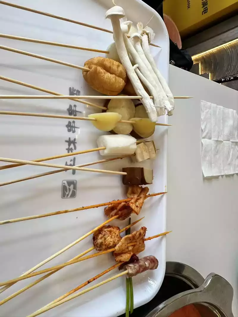 After a break, we went out to dinner at Leshan Xianzhiwei Bobo Chicken. Since we couldn't arrange a trip to Leshan on this trip, we took my mom to eat at the most famous Bobo Chicken restaurant in Chengdu. We chose the skewers ourselves and poured the sauce on them. My mom and I ordered one with Sichuan peppercorns and one with red oil, as well as a tofu bun. They were so delicious.
