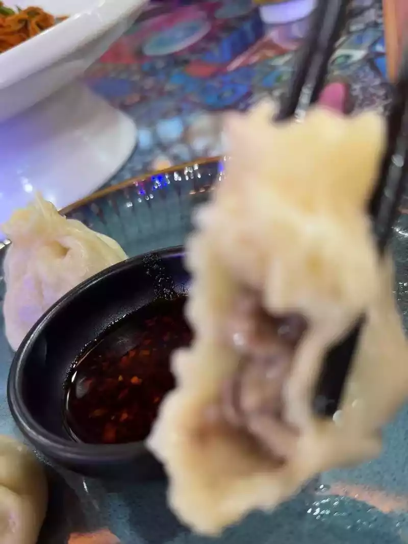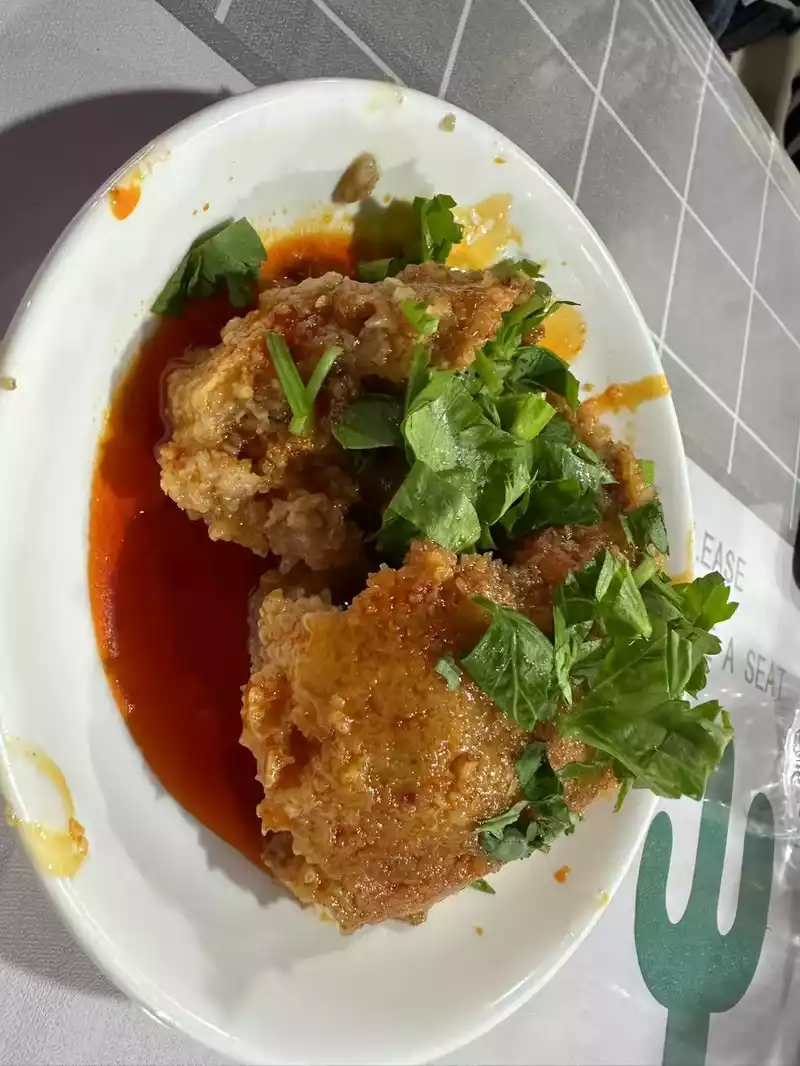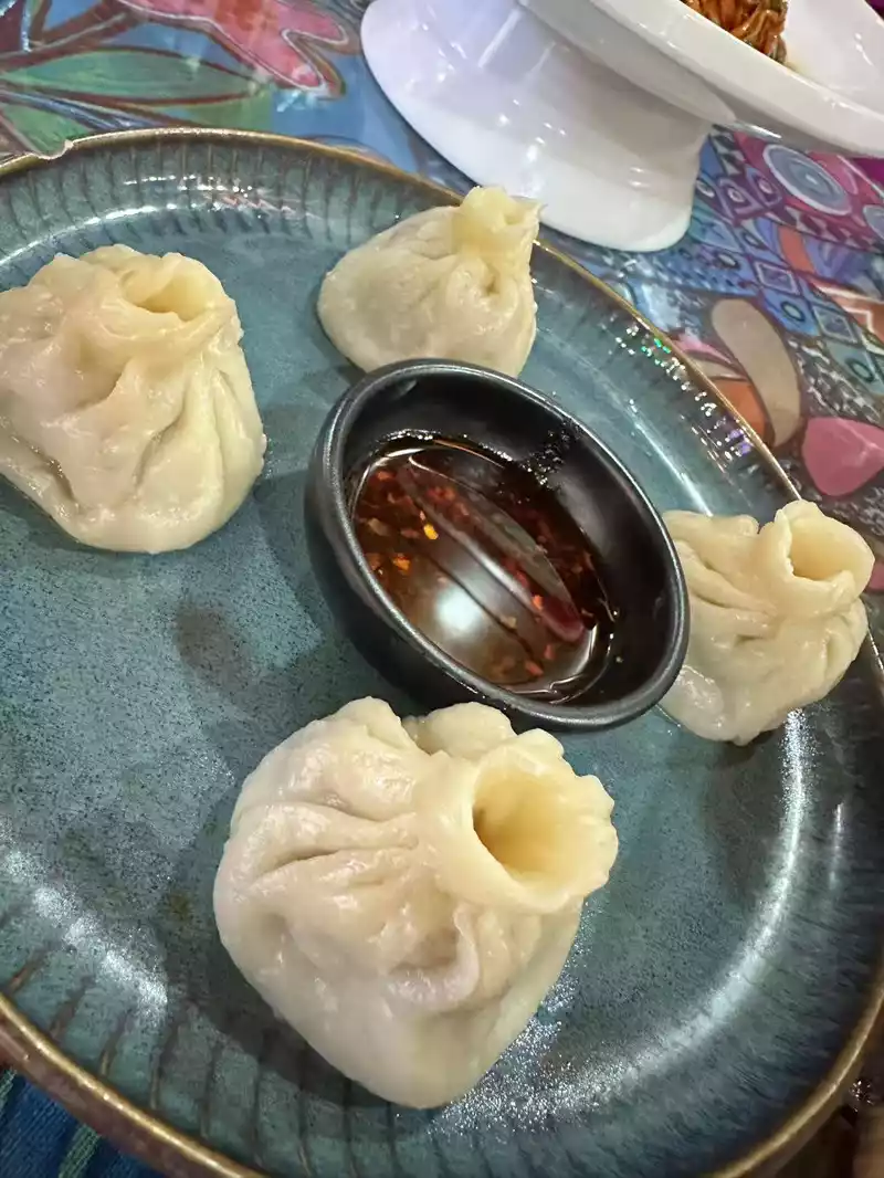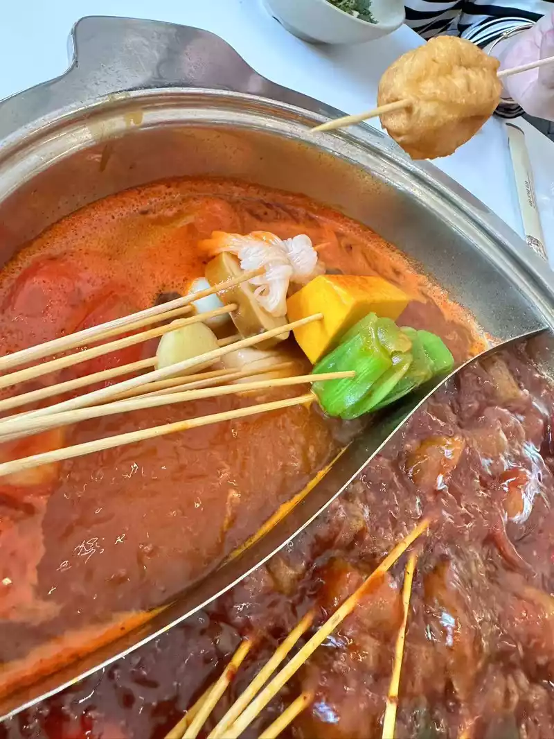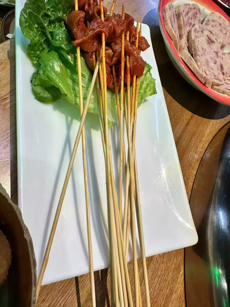 After a break, we went out to dinner at Leshan Xianzhiwei Bobo Chicken. Since we couldn't arrange a trip to Leshan on this trip, we took my mom to eat at the most famous Bobo Chicken restaurant in Chengdu. We chose the skewers ourselves and poured the sauce on them. My mom and I ordered one with Sichuan peppercorns and one with red oil, as well as a tofu bun. They were so delicious.