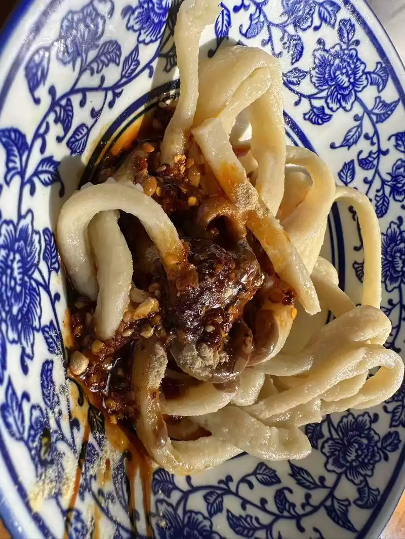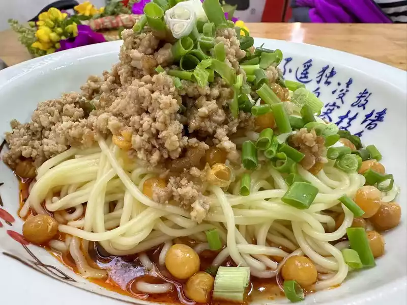 At about one or two in the afternoon, we ate dandan noodles and sugar-oiled fruits in the ancient town,