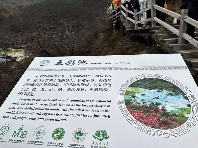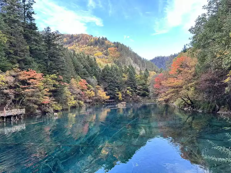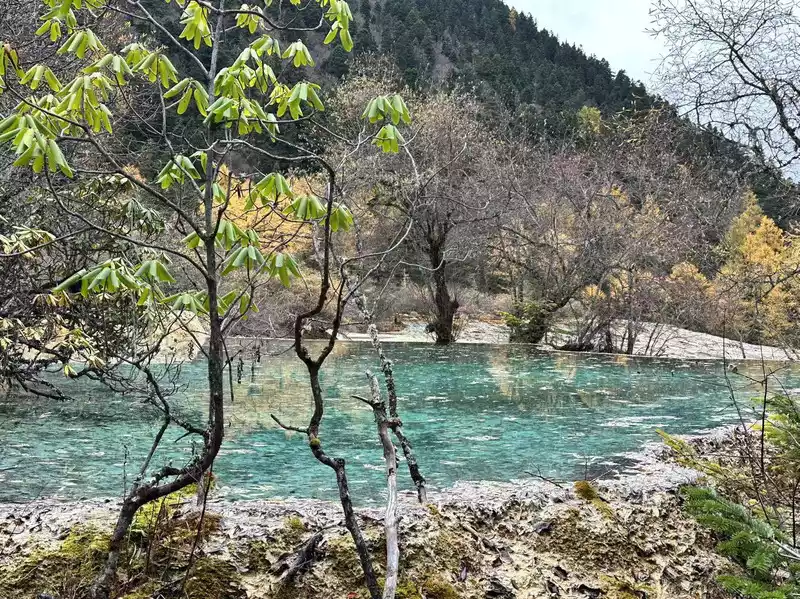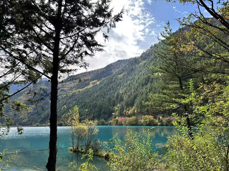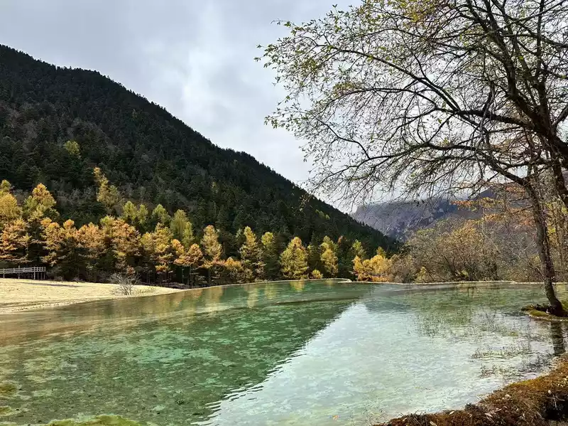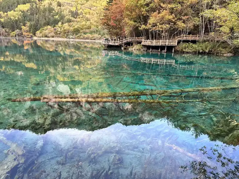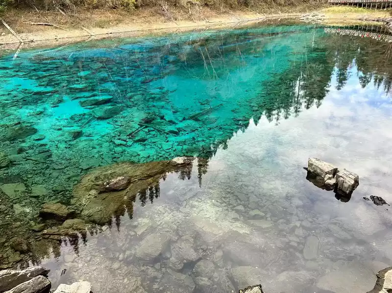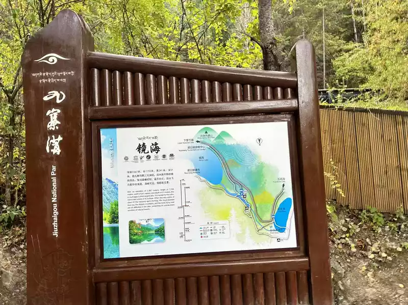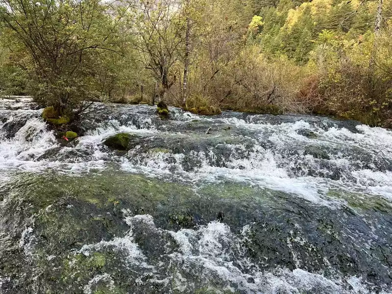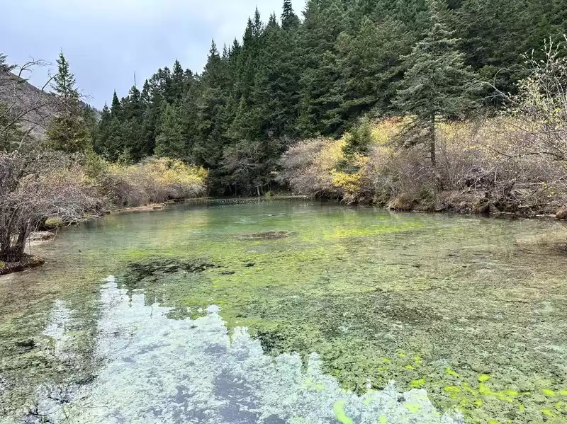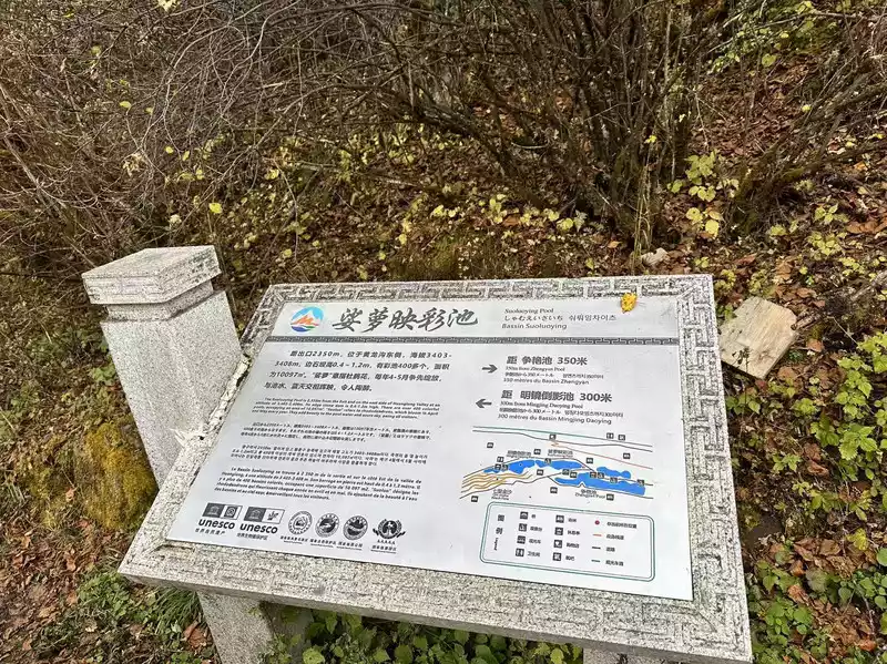 Then follow the road signs and walk about 800 meters to Wucai Pond (Wucai Pond is the smallest lake in Jiuzhaigou, but the most colorful one).