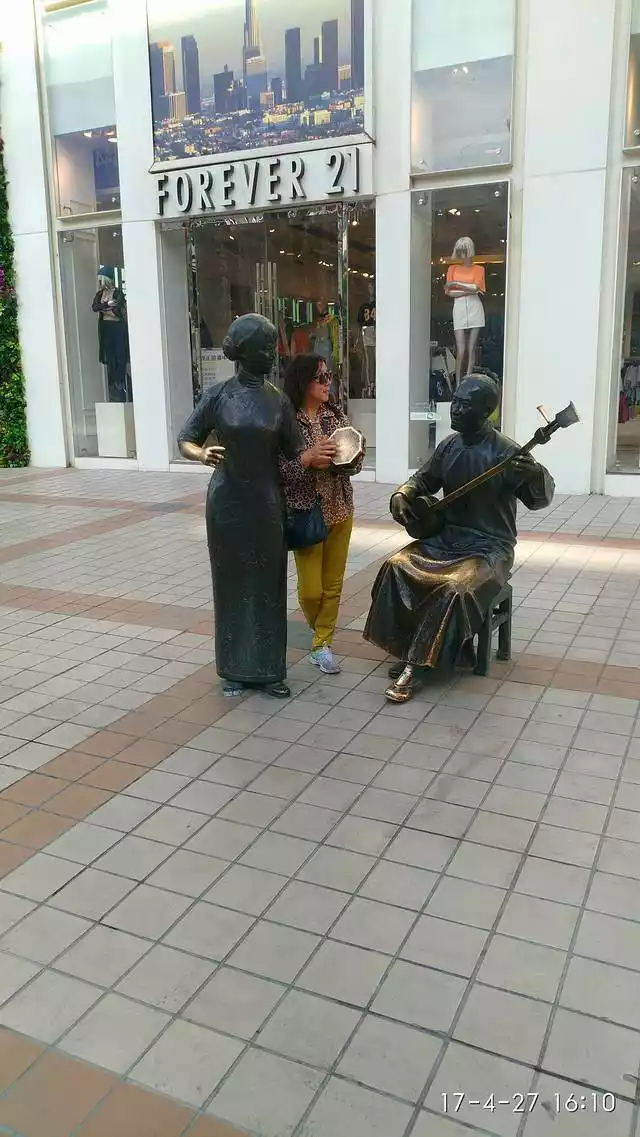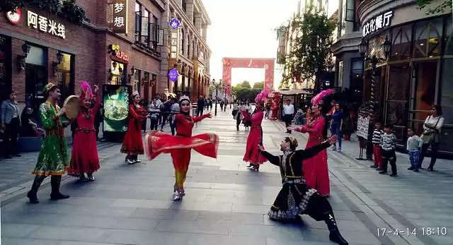 Xinjiang girls dance in front of the Xinjiang cultural restaurant on Han Street.