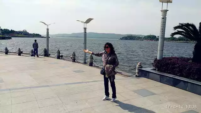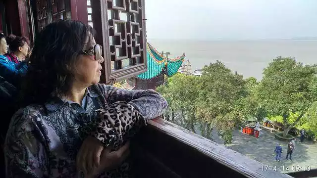 Climb the building and overlook, the lake and sky are two-colored. The color of Dongting Lake seen here is yellowish, and it seems that the water is not very deep. When I saw on the city wall, where Dongting Lake and the Yangtze River meet, the blue Yangtze River water and the light Dongting water were clearly seen. The Dongting Lake seen on the shore of Dongting Lake in Baling Square last night is still surging and majestic.