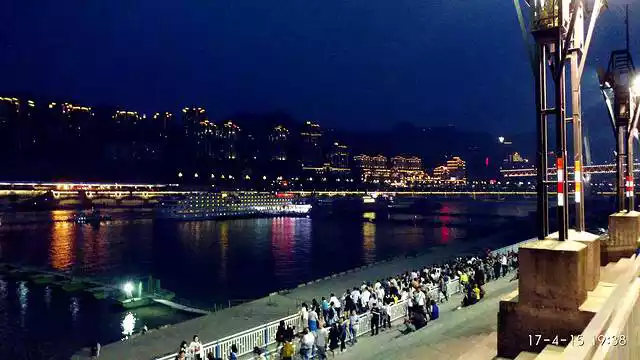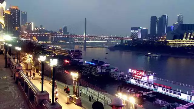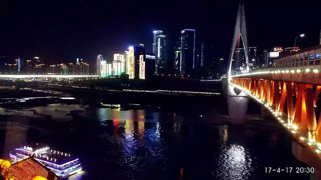 to the left of Chaotian Gate is the Jialing River. Looking at the past from Chaotianmen Square, the Qiansimen Jialing River Bridge is so magnificent, as well as the two river cruise ships on the river and the scenery on both sides of the Jialing River, they jointly outline the beautiful night view of Chaotianmen Wharf.