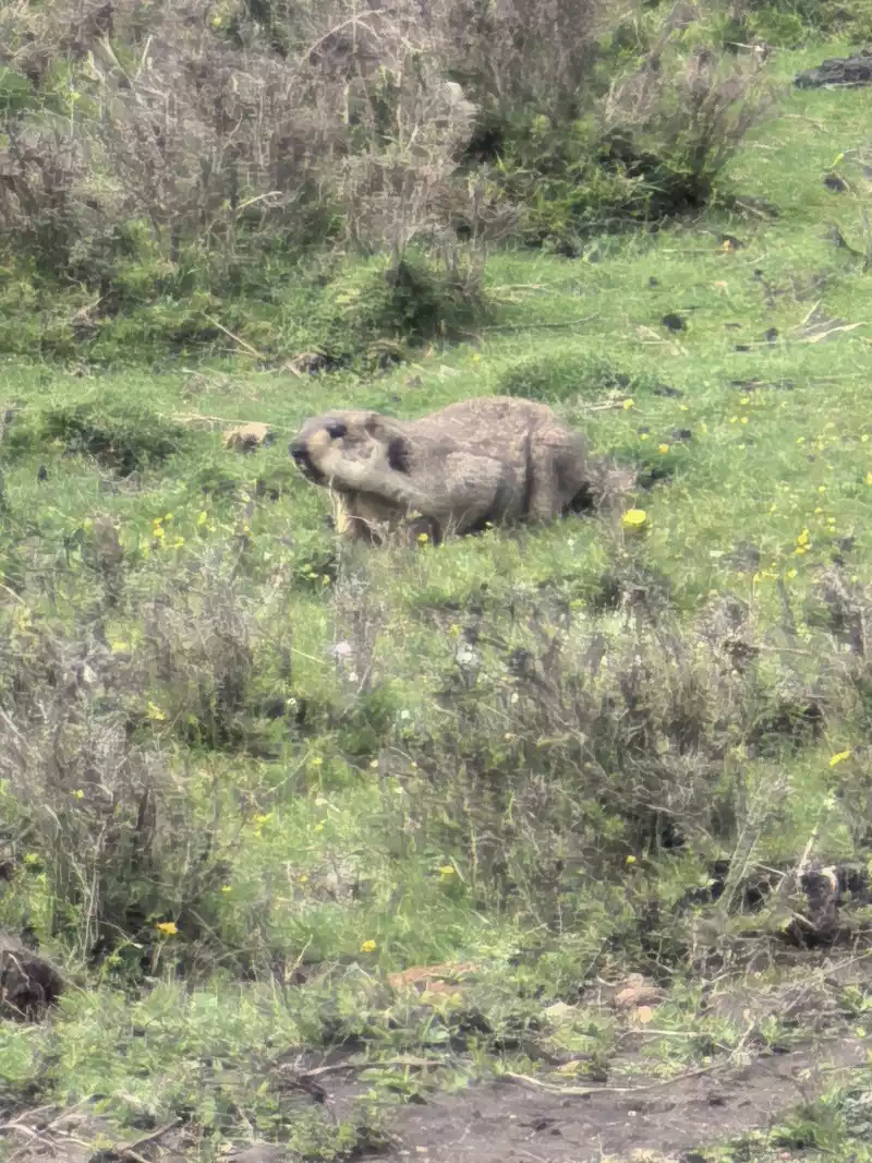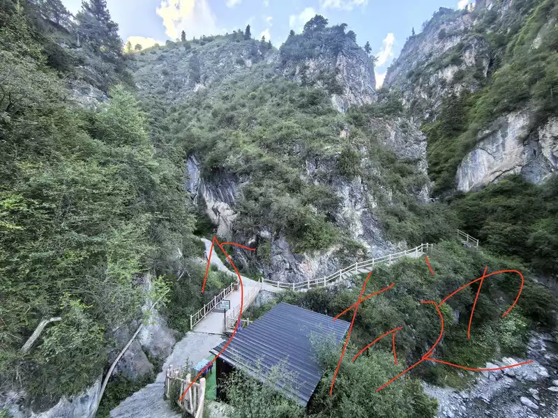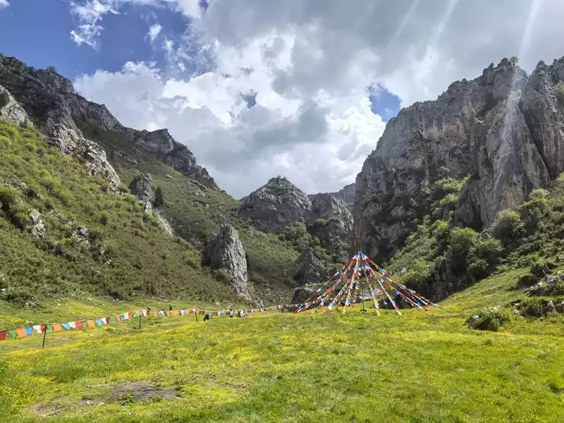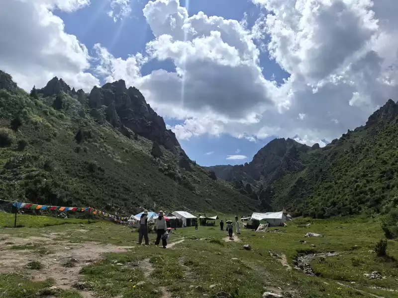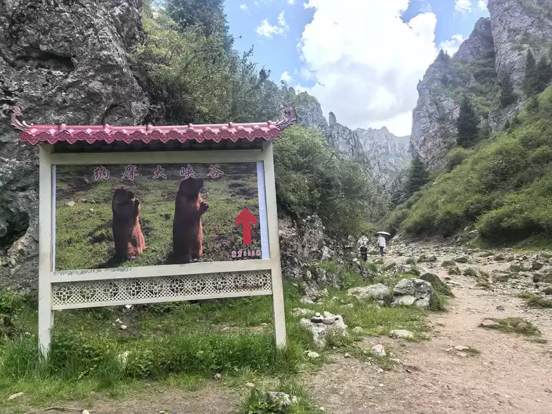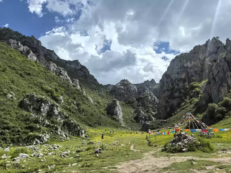 Namo Grand Canyon, when doing a guide, it is said that you can explore the source of the Bailongjiang River, of course, you need to hike more deeply to get there. You can also hike along the Bailongjiang River to an open lawn and take your children for a light hike. You can also ride a horse back and forth, the road is full of horse manure, and I also bought 4 pairs of shoe covers for this. As a result, the time period we went to should be the dry season of the Bailongjiang River, and after walking for a while, there was no water at all, it was all an underground river, and not a single horse was seen... At the end of the hike, we reached the open lawn, where drinks and food were sold, and there were many groundhogs nearby... The hole, the groundhog is a thing I haven't seen. There are also tourists who see groundhogs, which depends on your luck. After resting for a while, the sky suddenly changed in the canyon, and there were dark clouds and thunder, so we hurried back. Fortunately, it rained a little when I got to the parking lot. It is estimated that the canyon is relatively large.Then I drove to the direction of Tangke Town