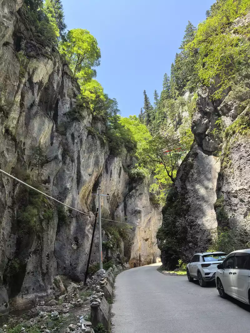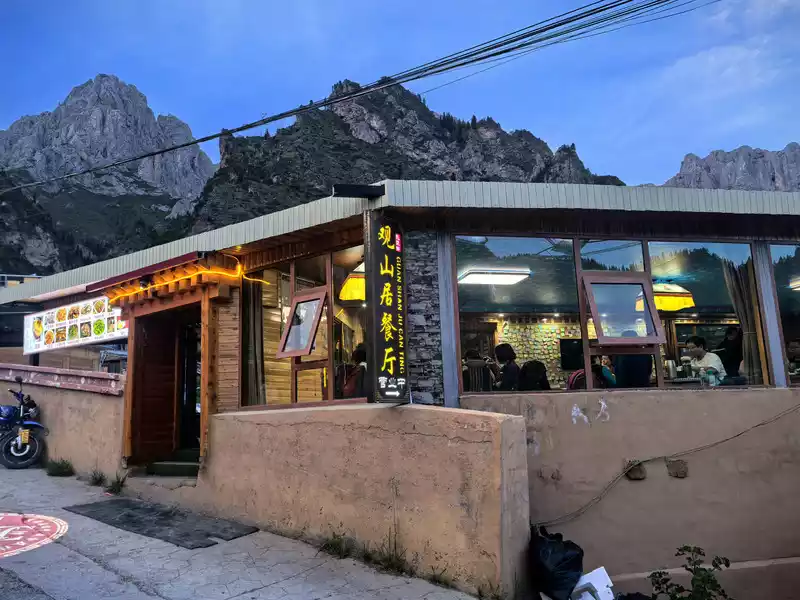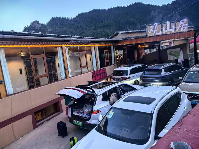 got up late today and didn't catch up with the hotel's breakfast (the breakfast here is very simple, so it's okay not to eat it), I went to the street and ate a beef noodle and set off for Lixian , and then took the Lixiao Road.Li Xiaolu is also a one-day landscape road that has only recently become popular, we didn't make a careful strategy, and we stopped along the way to see where there are more parking lots. There are no attractions today, just drive to the gate of Shuangqiaogou Scenic Area before dark, the hotel has canceled before, prepare to go to the scene to book again, and it can be cheaper. Finally, I stayed at the 260 yuan Xiaojin Aether Hotel, which is decent, convenient to park and eat, and very close to the gate of the scenic spot. The hotels here are generally next to the river, the river is quite fast, and people who sleep lightly at night are estimated to be affected by the sound of the water. We had a quick meal across from the hotel and rested.