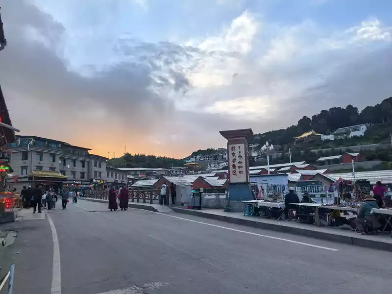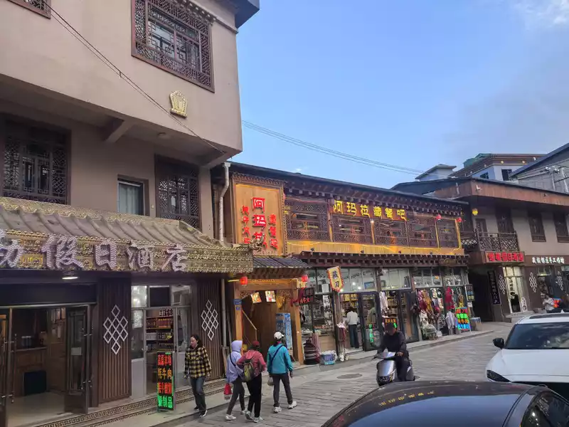 Drive from Huahu to Langmusi Town, which only takes more than 40 minutes. I remember walking on a section of National Highway 345 in the middle, wow with fewer cars and less scenery, and then going to Tangke to take another section of National Highway 345, the same car and fewer scenery are highly recommended. When you arrive in town, go to the B&B to check in, and then sleep in the B&B. At 7 o'clock in the evening, I walked from the homestay to the town, and the town was very lively. There are many hotels and shops, and there are also many travel photography shops. The Bailongjiang River passes through the town, and the Bailongjiang River is bounded by Gansu on one side and Sichuan on the other. Internet celebrity Tibetan restaurants need to wait for a table, we ate a skewer, compared several travel photography shops, and booked a Tibetan clothing travel photo for the two babies tomorrow morning at Langmu Temple in Gansu Province. The B&B I stayed in today is 399 yuan, which is very average, the room is very small, the toilet smells bad, and the B&B basically has no waiters, so I won't recommend it. The travel photography shop is called a small travel photography shop, 499 for two people, all the negatives are sent for refinement 10 sheets, the child's mother mainly likes their clothes are more good-looking and suitable for my two babies. The photographer should be their cooperation, put on makeup and go directly to the temple, someone will contact and start shooting, more on that later.