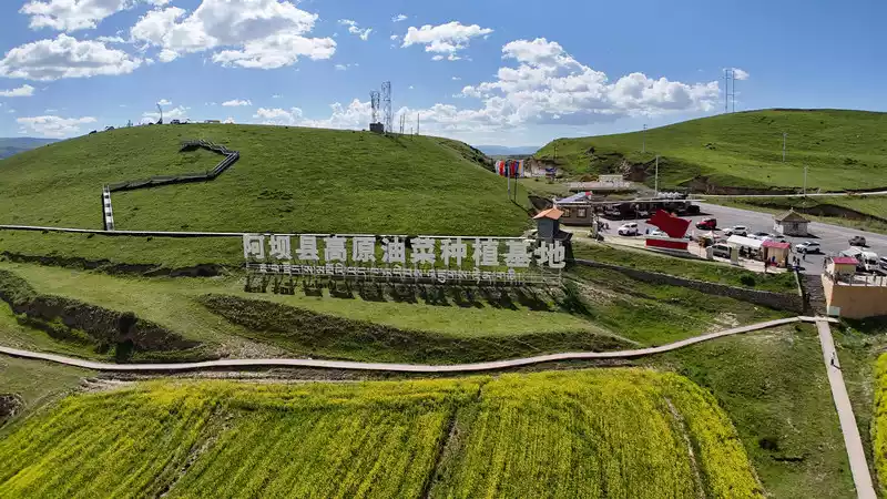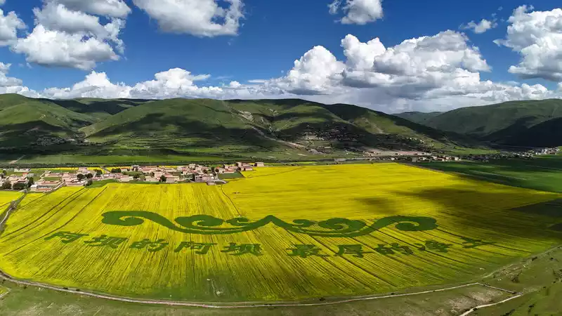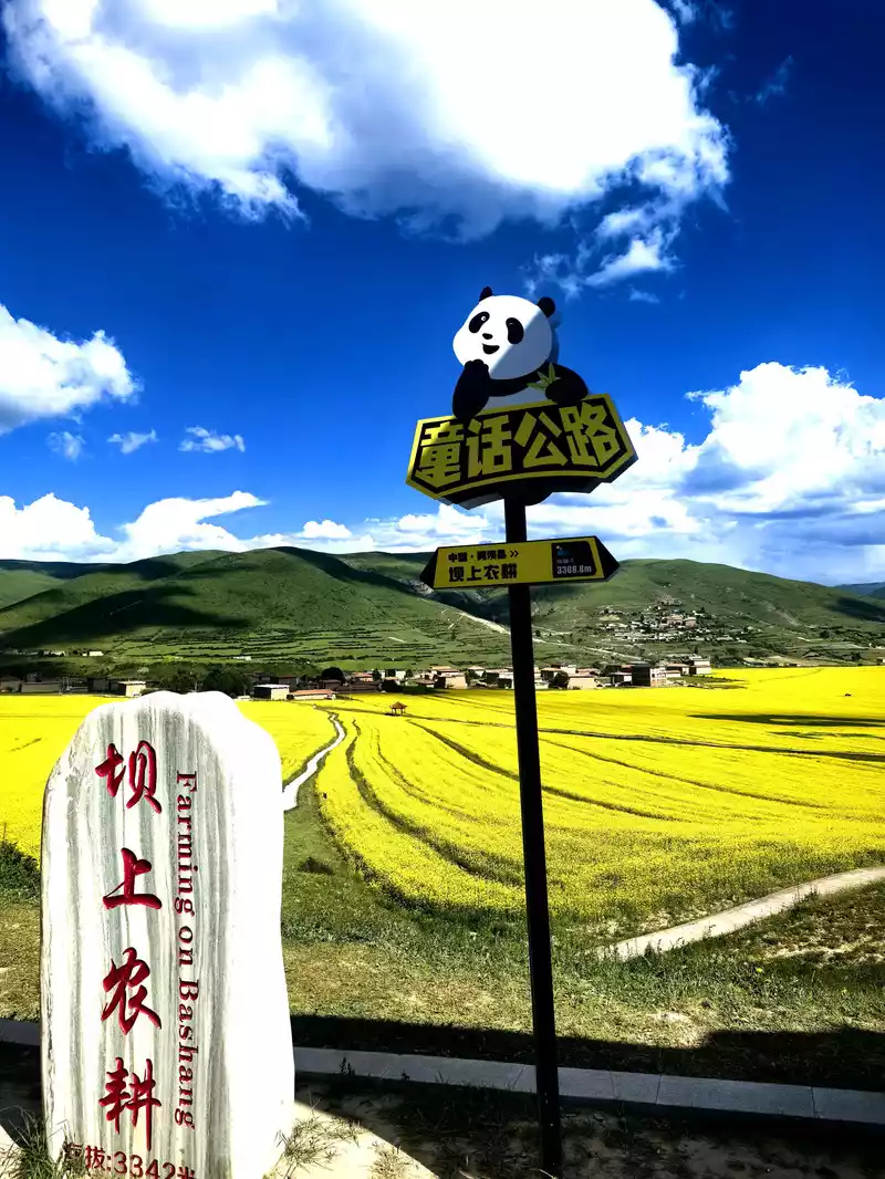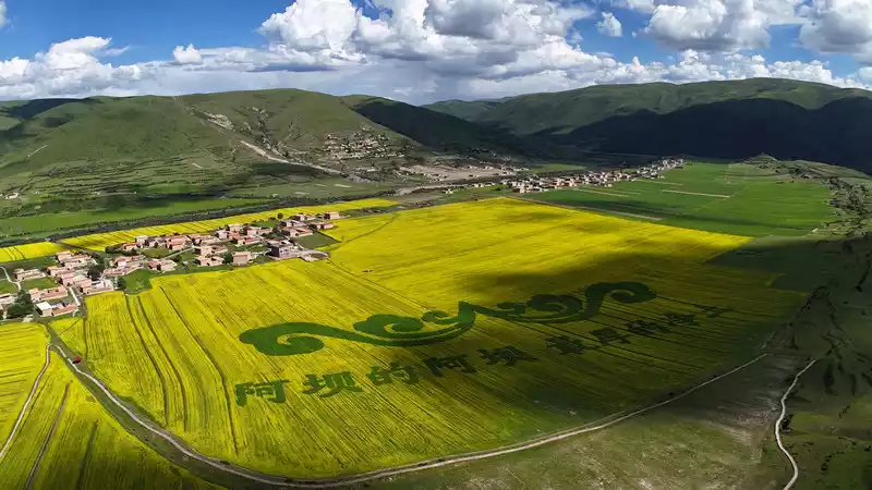 Today's itinerary is to Aba County, along the way there is the first bay of the Yellow River Jiuqu, Manze Pond, we didn't go in, we flew a drone in and went in for nothing. There was still plenty of time, so I went to the nearby Gemo Temple in Aba and then to the hotel in the county seat. Aba County is very large and prosperous, and Aba Prefecture is even more magical, with many tourism resources. The tourism slogan of Aba County is " Aba of Aba, the thickest pure land", yes, "thick" is not "back", when I was about to arrive in Aba County, there was a rapeseed flower field, and there was a huge slogan in the flower field.