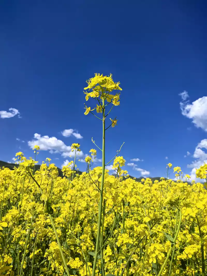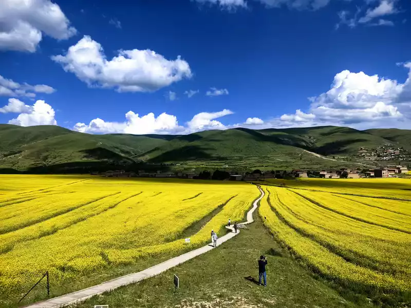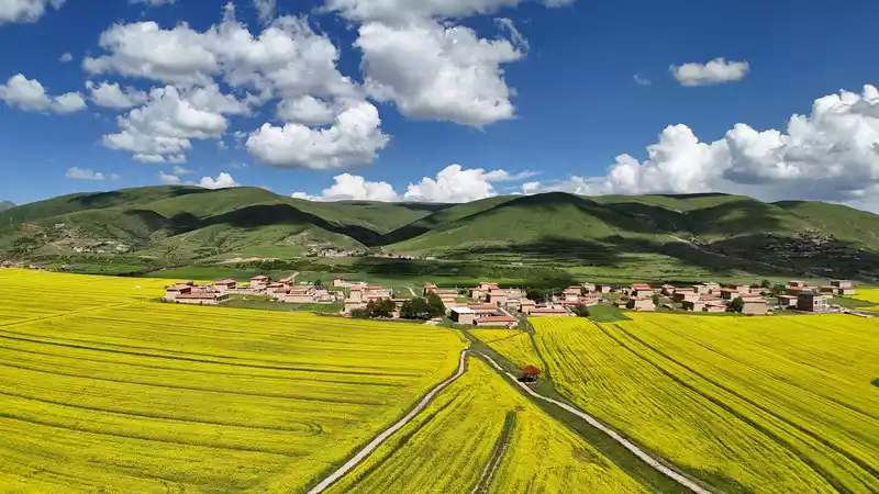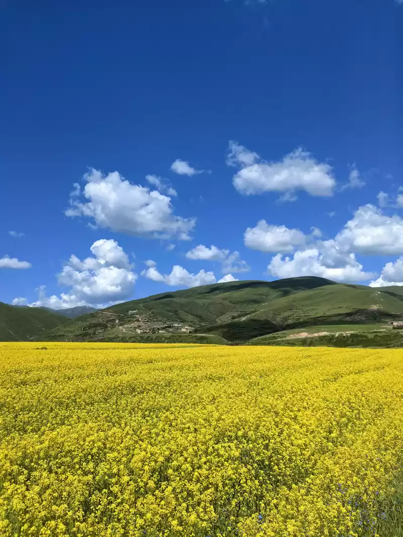 After flying the drone, continue to set off, follow the navigation all the way to the grassland road, and when you are about to arrive in Aba County, you will pass a rapeseed flower field, which is the time when the rape flowers are in full bloom, and the name of the attraction is Bashang Farming. In fact, there is also a rape flower on the side of the first bay of the Yellow River, but we didn't turn in, that piece is not on the side of the road. And this piece is on the side of the road, and there is an observation deck.