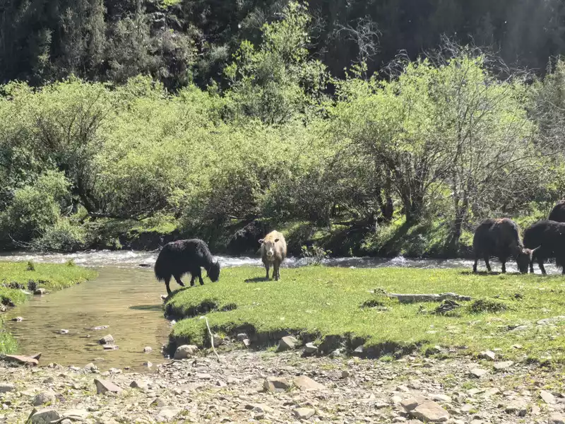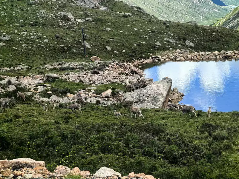 After returning to Panyangping, the child was also more comfortable. We drove back to the Heyuan parking lot and took the Jingjiao bus to the lake of Zagarcuo. It was already half past two in the afternoon. On the way down from Panyangping, I saw a group of deer by a small lake, and I didn't know if the breed was wild.