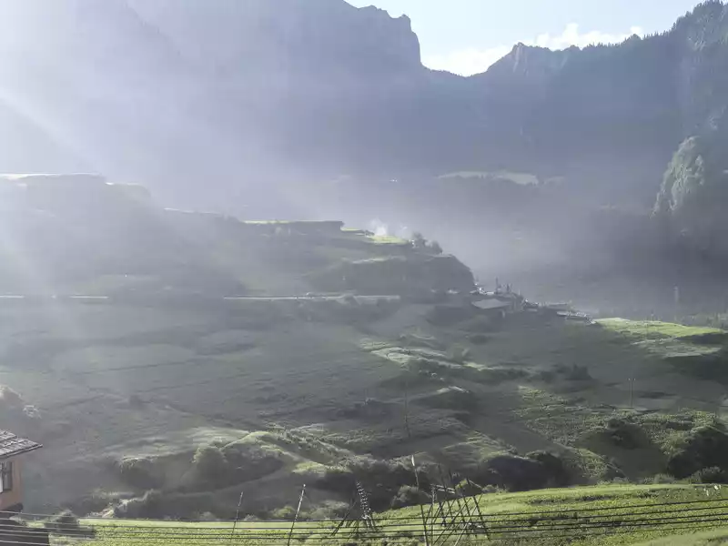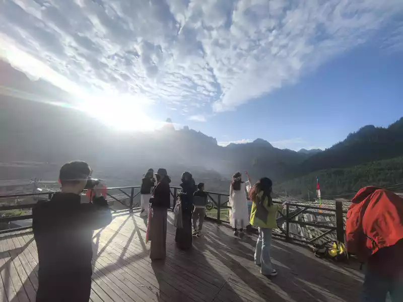In the morning, many people come out to watch the sunrise, strictly speaking, it is not the sunrise, Zayin Ga is surrounded by mountains, and the horizon cannot be seen, mainly looking at the changes in light and shadow after the sun emerges from the top of the mountain. I didn't go to the Dari Observation Deck, which was usually occupied by the old mages very early, so I got an observation deck near the B&B to take a picture and flew down the drone. Then I went back to the B&B for dinner and went to Fairy Beach.