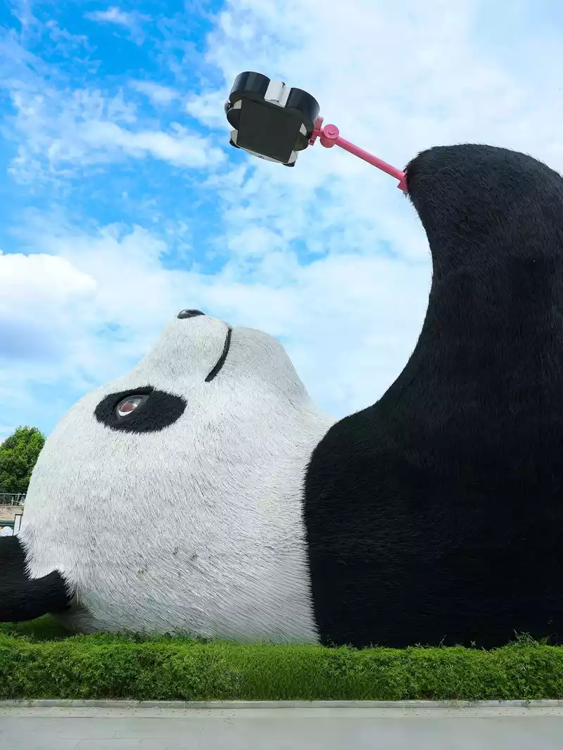 ✅ Yangtianwo Plaza: Check-in landmark! Look at the giant selfie panda lying flat and playing with the mobile phone, the shape is naïve, super interesting, remember to take a group photo!