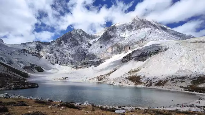 We first went to the short-term attractions, and after going uphill about 1 kilometer to the Xinbao Lake at an altitude of 4080 meters, we saw the whole picture of the highest peak of the Three Sacred Mountains of Aden - Xian Nairi (6032 meters above sea level), the majestic sacred mountain, shaped like a charity and tranquil Buddha, and there are tough and sharp lines like a pyramid, high ridges into the clouds, heroic, and emerald-like Baoxin Lake under your feet. The lake surface is like a reflection of the sacred mountain, which is breathtaking.