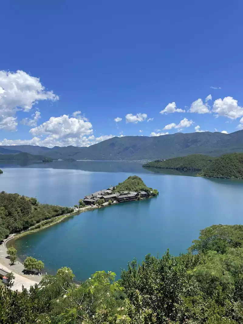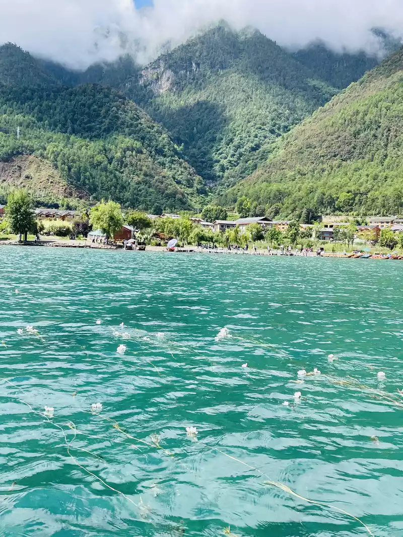 After about 1 hour of boat trip, we drove around the lake (about 70 kilometers), checked in the attractions along the way, and enjoyed the mountains and waters of Lugu Lake. The Rig Peninsula is a landmark attraction of Lugu Lake, looking down from a high place, it is like a tear that fell into Lugu Lake, the lake surface is as blue as a mirror, the surrounding green mountains, blue sky and white clouds are clearly reflected in the water, and the lake, mountains and clouds are integrated into pure beauty. Lover's Beach, Little Falling Water Village, and Goddess Bay are not to be missed.