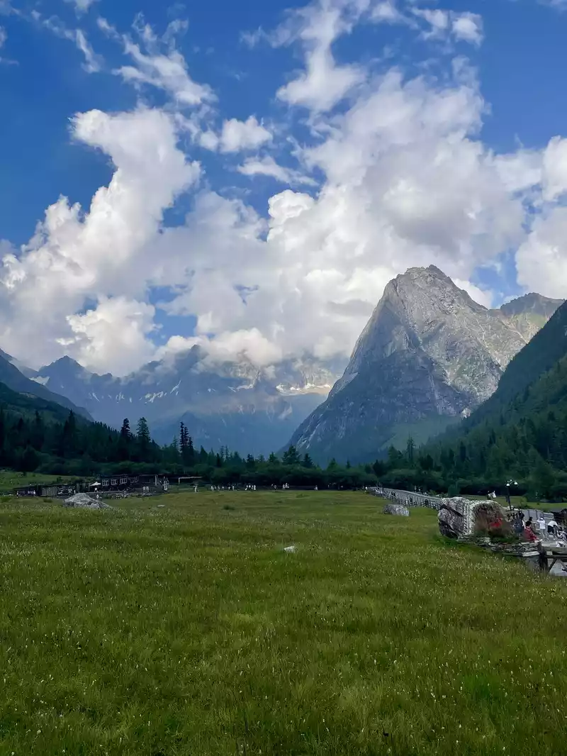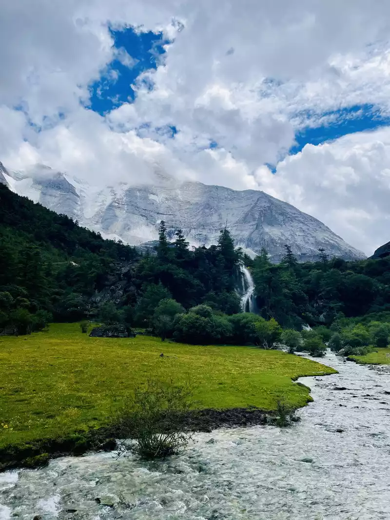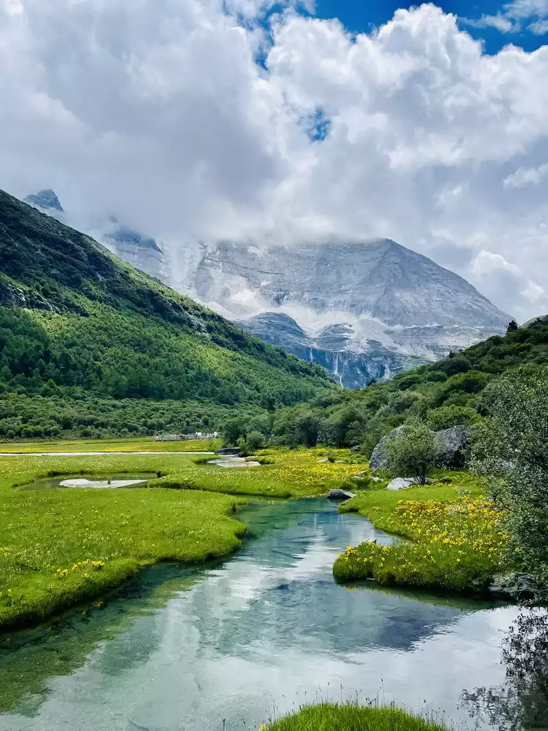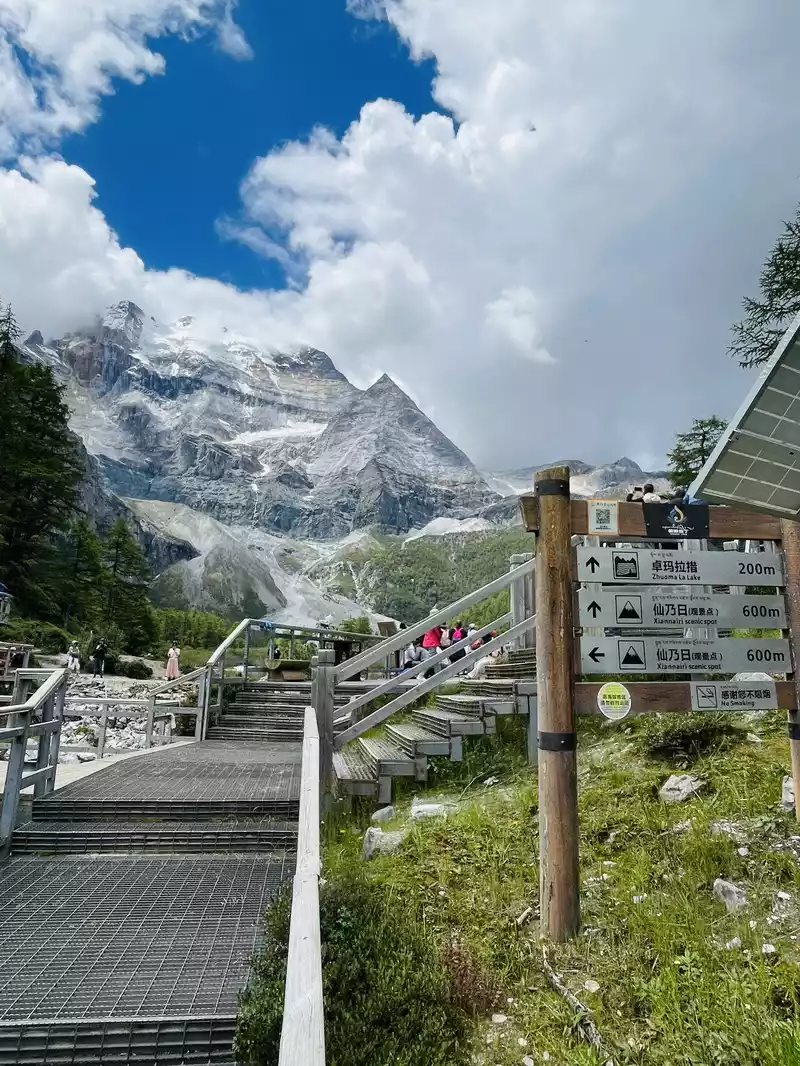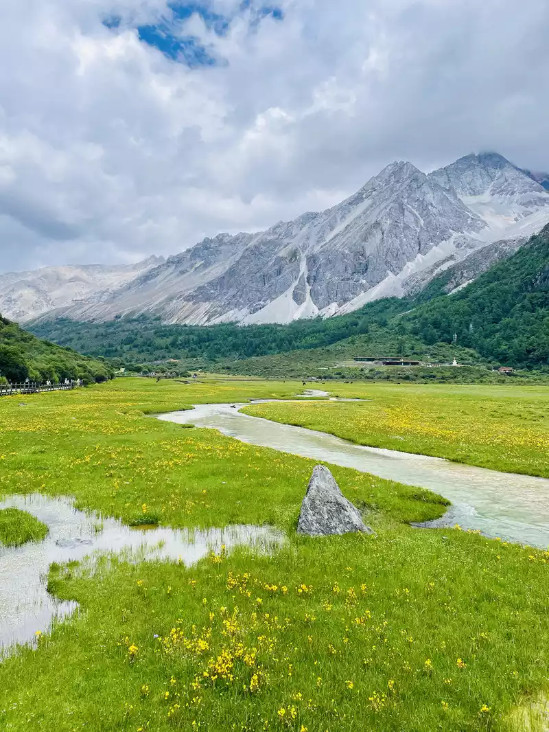 Temple In order to save energy, we did not go to the Pearl Sea (you can watch the Xiannai Day up close), but returned to Chonggu Meadow and took a battery car to Luorong Cattle Farm. Luorong Cattle Farm (4150 meters above sea level) is surrounded by three sacred mountains and is a good place to see the three sacred mountains. The ranch is full of wildflowers, the three sacred mountains are covered with ice and snow, spotless, walking along the plank road, snow peaks, forests, stream icefalls, alpine grasslands, every step is like stepping into a fairyland. At around 3 o'clock in the afternoon, the sky darkened, the temperature plummeted, we quickly returned, got on the bus and poured heavy rain, and when we arrived at the gate of the scenic spot at 5 o'clock, it was sunny again.