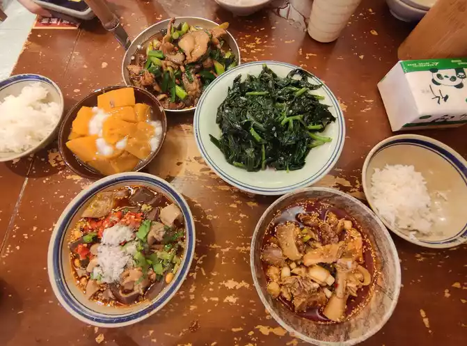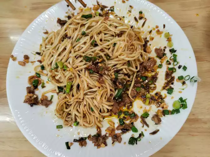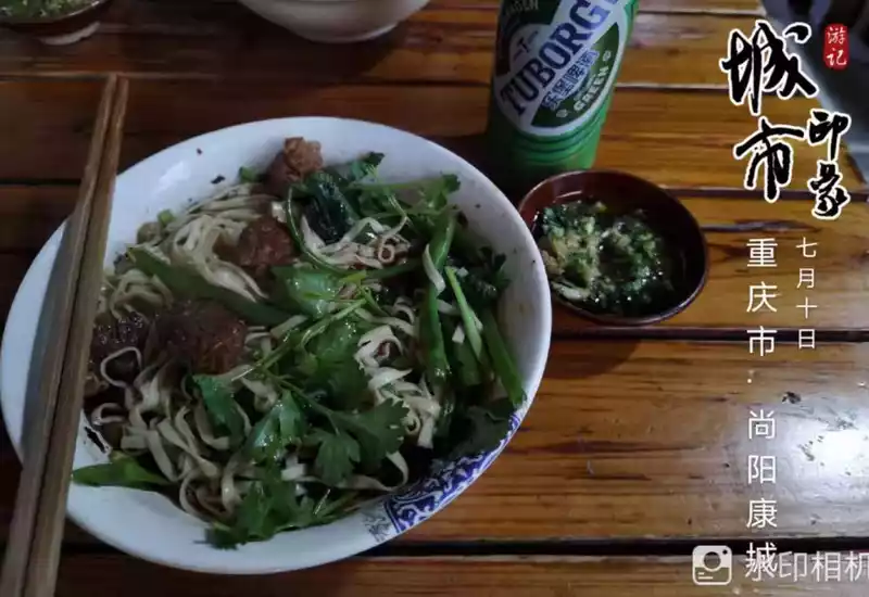 It was already noon when we arrived at the Zizitian B&B, the bed here is particularly large, two 1.5 meters, the B&B building is antique, especially several buildings are connected through the corridor on the second floor, and many B&Bs are concentrated here. The proprietress sent us WeChat about the delicious restaurants around, we walked to the "Cao Meier Overflow Noodle Restaurant", ordered chopped pepper beef noodles, clear soup beef noodles, Yibin burning noodles, mushroom soup dishes and leaf cakes, a total of only 52 yuan, chopped pepper beef noodles are particularly outstanding, it is a kind of mixed noodles, green onions, garlic, chili peppers, peppercorns, sesame oil and other seasonings mixed with thin noodles, just right. The noodles are carefully crafted through more than 20 processes, like a carefully carved work of art, and the noodles are secretly made after countless repeated stir-frying and taste.Mushroom soup is a vegetable soup cooked with shiitake mushrooms and a kind of vegetables and seasonings, which is light and fragrant. The story of the owner and his wife starting a business is pasted on the wall of the store, and in 2018, the noodle restaurant named after their daughter opened and was sought after by countless people. Worship the water of Dujiangyan, taste the overflow bowl noodles, "overflow bowl noodles" has become the food business card of Dujiangyan!