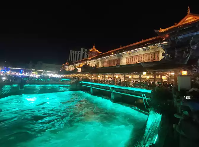 After eating, we walked to the river to watch the night view, passing by the pedestrian street, the roadside is a variety of stalls selling snacks, from time to time we heard shouting and selling, crowds of people, lively, the ancients would not have thought that the Dujiangyan water conservancy project would become a valuable tourism resource after a thousand years, bringing huge flow of people and income to the local area. When we squeezed to the riverside, we could see the rapid water coming from the Minjiang River, and the phenomenon of "blue tears" was produced under the joint action of lights, which is a dream scene where bubbles and minerals in the water flow enhance the refraction and scattering of blue light, forming a dream scene like flowing teardrops. We ended the day by strolling back to the hotel while enjoying the night view.