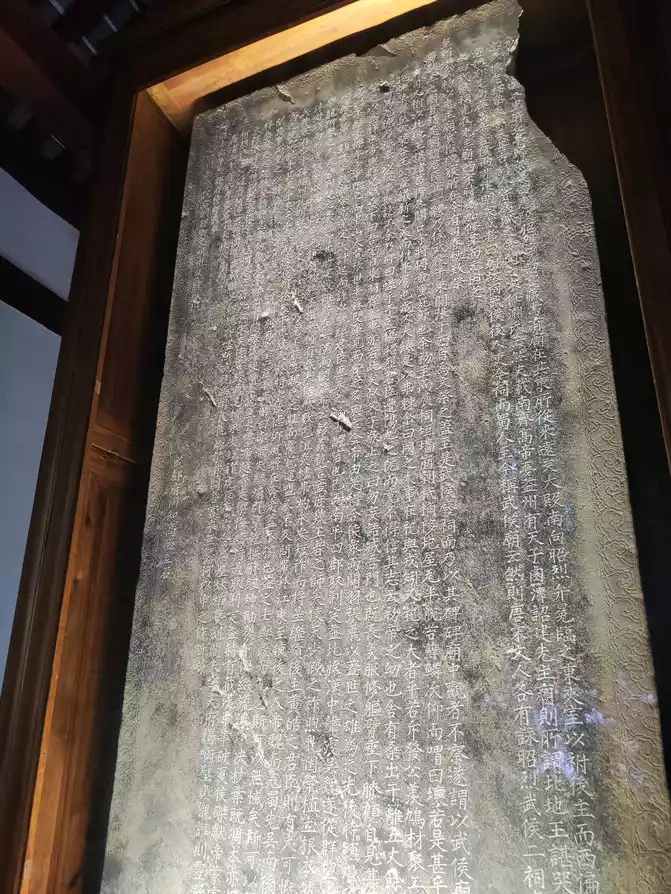 The first thing you see when you go inside is the Ming Monument and the Tang Monument. The Ming Monument is a stele inscription cultural relic established during the Jiajing period of the Ming Dynasty (1547), written by Zhang Shiche, the governor of Sichuan, and erected a monument by Gao Deng, the deputy governor of Chengdu Prefecture, and the inscription contains a preface and a seven-character rhythm, recording the historical evolution of the Wuhou Temple and Liu Bei's life. The tour guide explained that the ancestral hall that worshipped Zhuge Liang was not with the ancestral hall that worshipped Liu Bei, and because of the strong incense of Zhuge Liang's ancestral hall and Liu Bei's ancestral hall was relatively neglected, the Zhuge Liang ancestral hall was moved over and put together. The Tang stele, also known as the "Three Absolute Monuments", was erected in the fourth year of Tang Yuanhe (809), written by Pei Du, engraved by the famous craftsman Lu Jian, with a height of 3.67 meters, and is a national first-class cultural relic. The inscription praises Zhuge Liang's merits, and Liu Gongchuo's calligraphy is strong, which is combined with Pei Du's articles and Zhuge Liang's merits to combine the "three uniques".