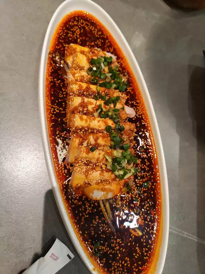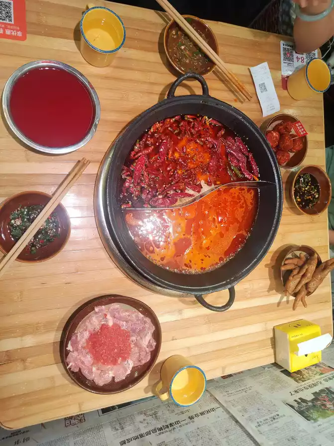 After visiting Sanxingdui, we took the bus back to Chunxi Road, and then walked to the "Cui Lady Old Hot Pot" for dinner, this store is also very famous, it is opened in an alley, and there is already a queue when you arrive at 5 o'clock. Going up to the second floor of the store, we ordered mandarin duck pot, hand-made tomato tender meat slices, cheese meatballs and fresh meat wrapped, chicken feet, duck blood, egg fried rice, mochi... The wall of the store says that each ingredient needs to be blanched for a few minutes, and the classic standard of the saucer is "garlic paste + coriander + sesame oil", "hot pot sauce is the soul!" It turns out that it is rich in unsaturated fatty acids and vitamin E, which has antioxidant, laxative and cardiovascular protection. After eating, I feel generally satisfied, the seasoning is distinctive, there are many famous hot pot restaurants in Chengdu, we tried this one, after all, hot pot can't be eaten every day.