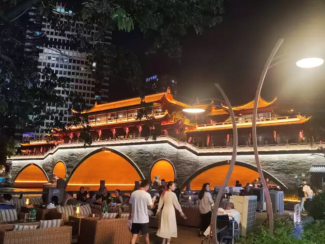 After eating hot pot, we took a taxi to Jiuyan Bridge, where there is a bar street by the river and a night view. When we arrived at our destination, we strolled by the river and went to count the bridge holes of the Nine Eyes Bridge, and found that we couldn't count the nine eyes. Later, I checked the information and found out that the Nine Eyes Bridge was built in the Ming Dynasty, and there were indeed nine caves under the bridge. In 1992, the old bridge was demolished due to flood discharge, and the new bridge is now 1.9 kilometers away from the original bridge and was completed in November 2001. There is also a legend about the Nine Eyes Bridge, when Zhang Xianzhong was defeated in Sichuan, he hid gold and silver jewelry in the area of the Nine Eyes Bridge, and in the 30s of the 20th century, stone cows and stone drums were salvaged from the bottom of the river. The Jiuyanqiao area is one of the "Eight Beautiful Night View Check-in Places in Chengdu" and is the pearl of Chengdu's night scene. We walked west along a street of bars by the river, the sky was getting dark, and on the side of the road were contiguous bars, colorful neon lights were lit up, and the resident singers inside had begun to play and sing, and the melodious and beautiful singing was endless. There is also a bridge on the west side of the Nine Eyes Bridge called "Anshun Covered Bridge", which also has a long history, the original building can be traced back to the Yuan Dynasty, and in Marco Polo's travelogue, the Anshun Covered Bridge is one of the four bridges that he is more impressed with. Of course, now the bridge is also redesigned and built, and it was only completed in 2003, with the style of the Ming and Qing dynasties. At night, the lights on the bridge are on, the roof and bridge holes are golden yellow, the bricks on the bridge are bright white, and the pillars under the eaves are red, and from a distance, the lines are beautiful and dazzling. Walking on the riverside path, blowing the river breeze, listening to music, and enjoying the night view, it was so pleasant to end the day's tour.