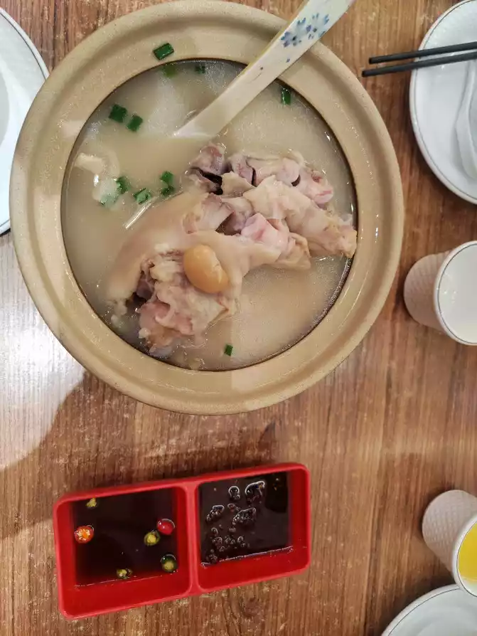 After visiting the panda base, we took the bus back to the vicinity of Chunxi Road and randomly found a "Granny Wang's Hoof Flower" for dinner, although it was just past 5 o'clock, and the store was almost full. We ordered hoof flowers, fat sausages, mixed noodles, etc., the hoof flowers are naturally great, it is cooked in a casserole, white soup, garnished with chopped green onions, large soybeans, etc., the taste is very delicious.