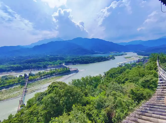 After lunch, we took a taxi to Gate 6 of Dujiangyan Scenic Area, and there was no turning back from here. As soon as I got out of the car, someone came over to recommend and explain, and we bought it by the way, the price was 30 yuan per person. Dujiangyan is a huge engineering system composed of canal head hubs (Yuzui, Feisha Weir, Baoping Mouth), water diversion channels at all levels in the irrigation area, various engineering buildings, large, medium and small reservoirs and pond weirs, etc., and Li Bing, the governor of Shu County in the late period of King Zhao of Qin, organized the people on both sides of the Min River to build it, which is a grand water conservancy project that is old, the only one that remains, and is characterized by damless water diversion. We first climbed the Qinyan Tower with the tour guide, and when we reached the highest floor, we could overlook the three major water conservancy projects of Dujiangyan, Anlan Bridge, Erwang Temple, Ancient Post Road, Yulei Xiongguan, Minling Snow Mountain, and Qingcheng Peaks, which was spectacular and an excellent place to take pictures of the panoramic view of the grand project. The tour guide here explained in detail the functions of different parts of the Dujiangyan water conservancy project, "fish mouth" is the core of the Dujiangyan project, which divides the water of the Minjiang River into two strands, that is, divided into "outer river" and "inner river", the inner river is narrow and deep, the outer river is wide and shallow, coupled with the existence of curves, so that 60% of the river water flows into the inner river during the spring plowing season, ensuring the irrigation demand of the Chengdu Plain; During the flood season, only 40% of the river water flows into the Neijiang River, effectively solving the flood control problem. Li Bing used natural conditions such as riverbed height differences and curves to achieve reasonable distribution of river water, reflecting the concept of harmonious coexistence between the ancients and nature. In addition, the "fish mouth" also has the function of draining sand and stones, which uses the principle of curve circulation to discharge most of the sand and gravel to the outer river, reducing the risk of blockage in the inner river.