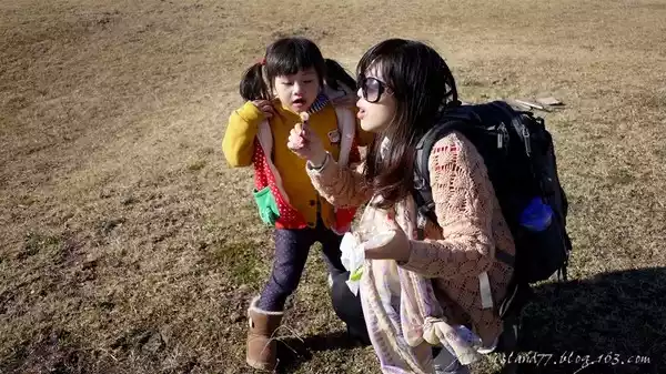 On the way down the mountain, the chick started to cry tired again, and it was already 2-3 o'clock, It is estimated that he wants to take a nap, so the super dad took out his killer feature and carried down the mountain with his strap.