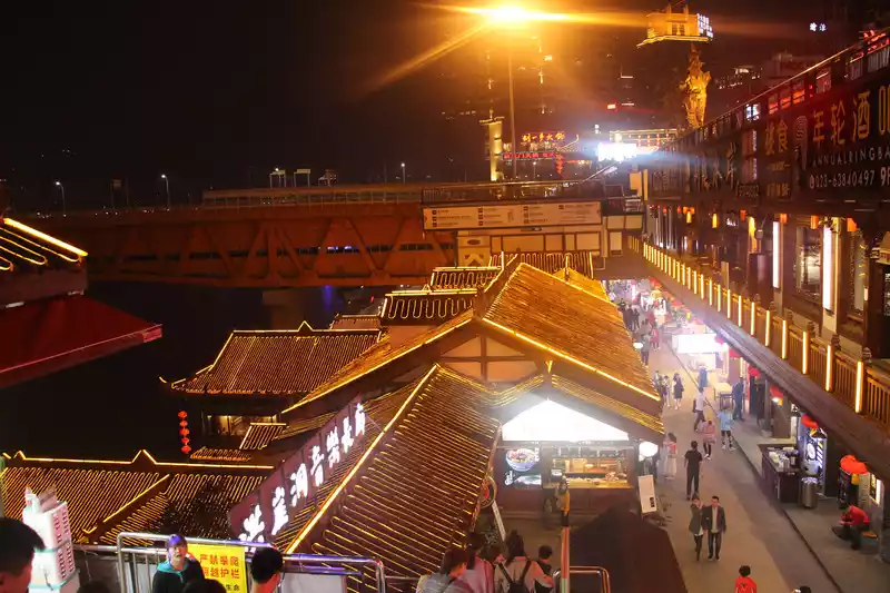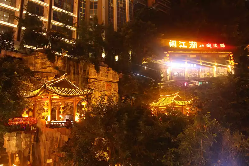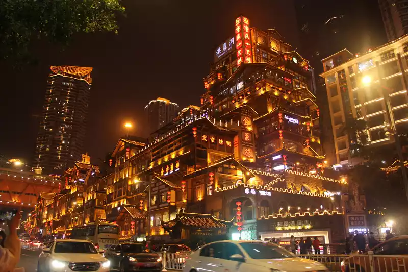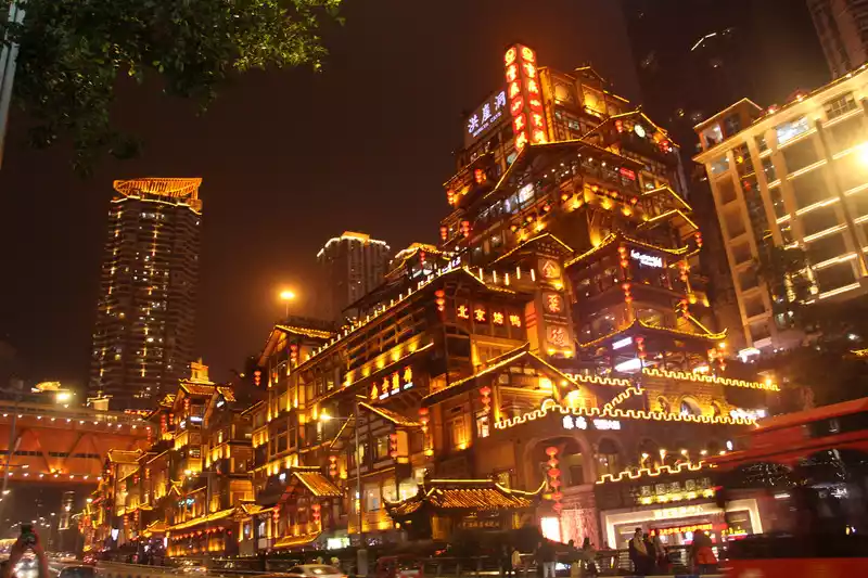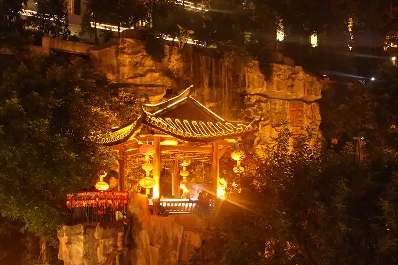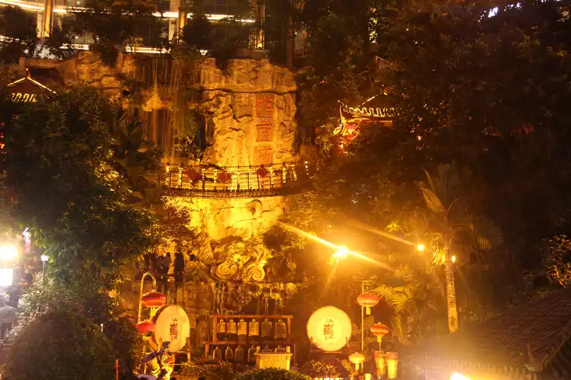 It wasbasically dark on the pedestrian street back from Ciqikou, so I went back to the hotel to rest for a while, and took advantage of the night to go to the most special place in Chongqing, Hongya Cave.