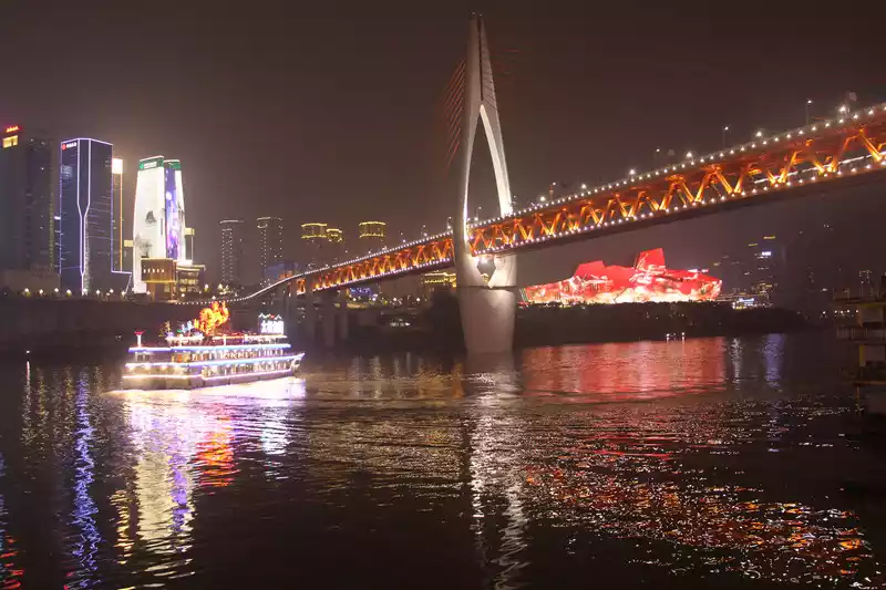 The night view of Hongya Cave can be said to be one of the best. On the one hand, the lights of Hongya Cave are brilliant, and on the other hand, the Qiansimen Bridge floats on the Jialing River.