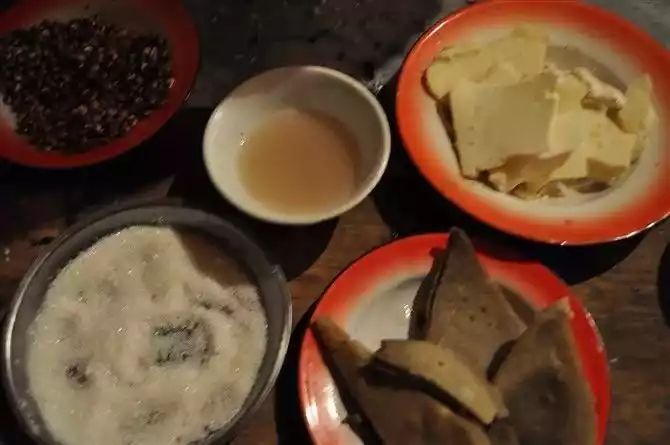 Highland barley wine, butter tea, cow dung potatoes, roasted flying chicken, the aroma of wine and tea, and the enthusiastic singing and dancing of Tibetan girls and young men. The food will make you put down the shelves of gentlemen and ladies, throw off your arms and tear the chicken and chew it, knead the rice cakes with your hands like Tibetans, and sing and dance around the huge pillars in the hall. What I want to say is that what you taste is not only Tibetan food, but also a kind of heroic spirit and magnanimity, and the intoxication and pleasure of "no blocks in the heart, everyone carnival under the moon".