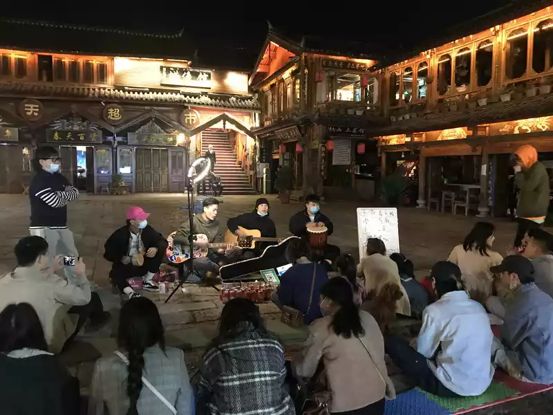 Lijiang Ancient City At night, young people in the ancient city play and sing with musical dreams.