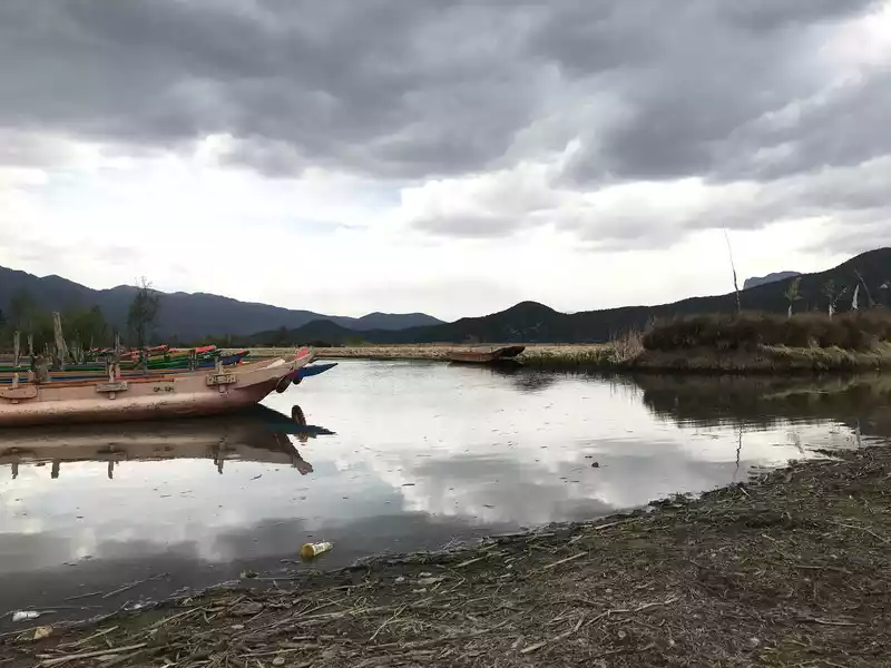 Lugu Lake Lugu Lake Goddess Bay, there are homestays, wooden boats, and Gemu Goddess Mountain (opposite). After May, there are still water-based poplars all over the lake, and the lake is shining with starlight and white flowers, but unfortunately, the sky is not warm enough, only dead branches float in the water, and you can't see it. Take a boat to the center of the lake, and you can directly take the water from the lake to drink.