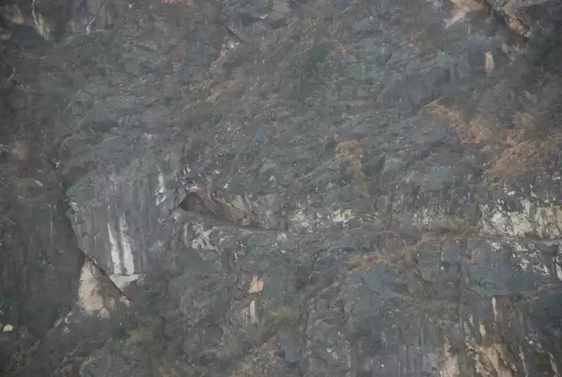 Tiger Leaping Gorge (Lijiang Section) The path between the mountain walls on the opposite bank is the former ancient tea horse road